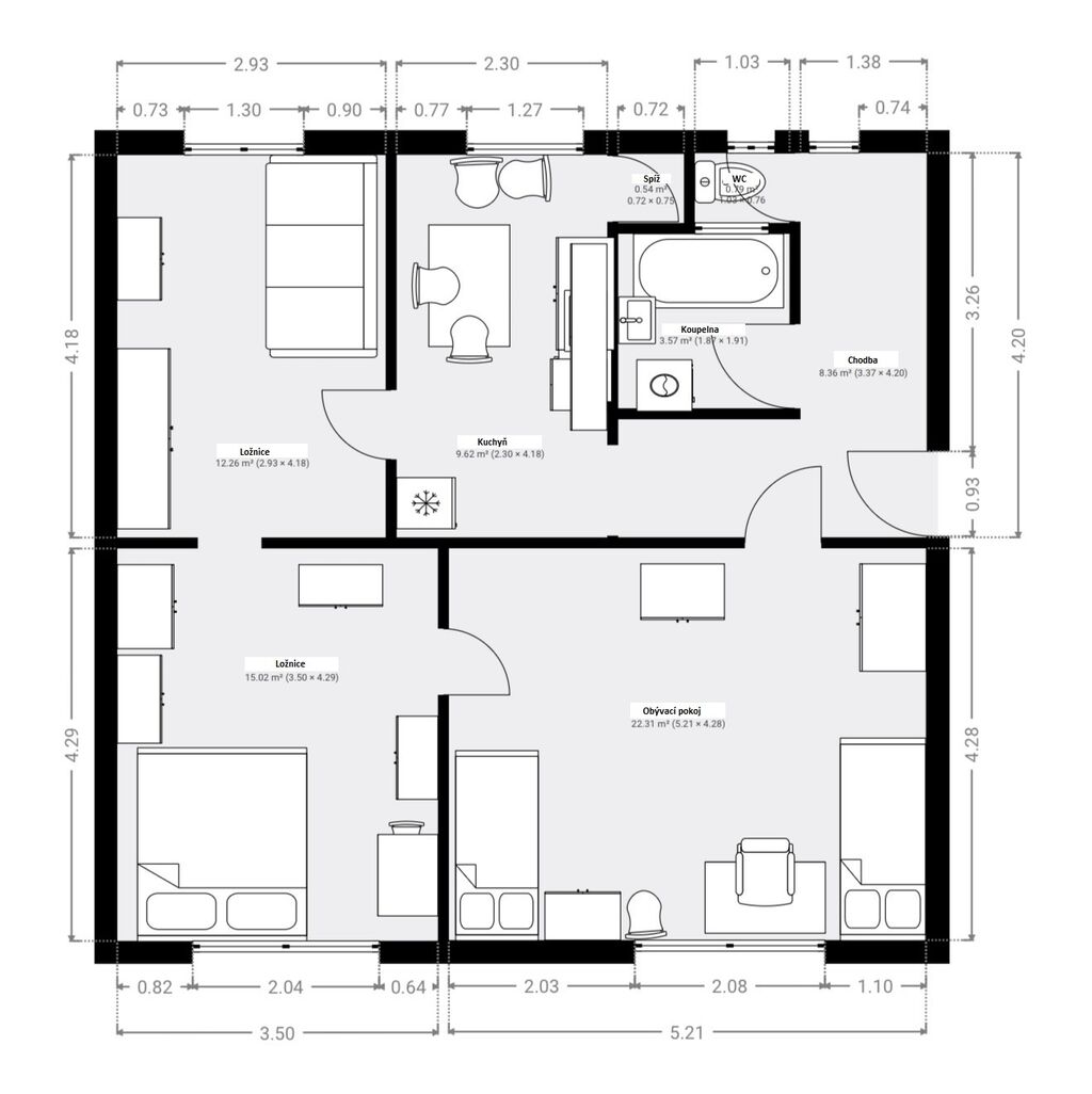Dispozice: kuchyně 9,78 m², obývací pokoj 20,7 m², pokoj 14,6 m², pokoj 12 m², hala 8 m², koupelna 3 m², spíž a balkon. Byt je ve velmi dobrém stavu, s praktickým rozložením jednotlivých místností.