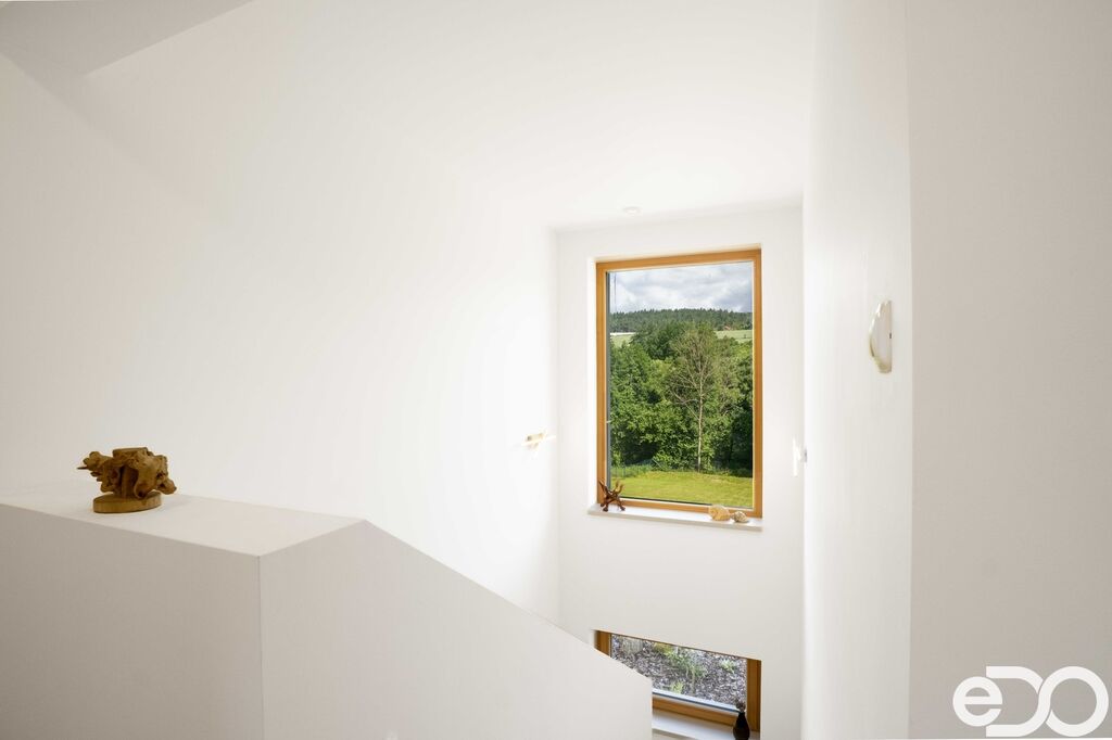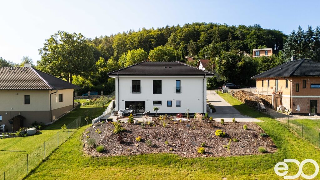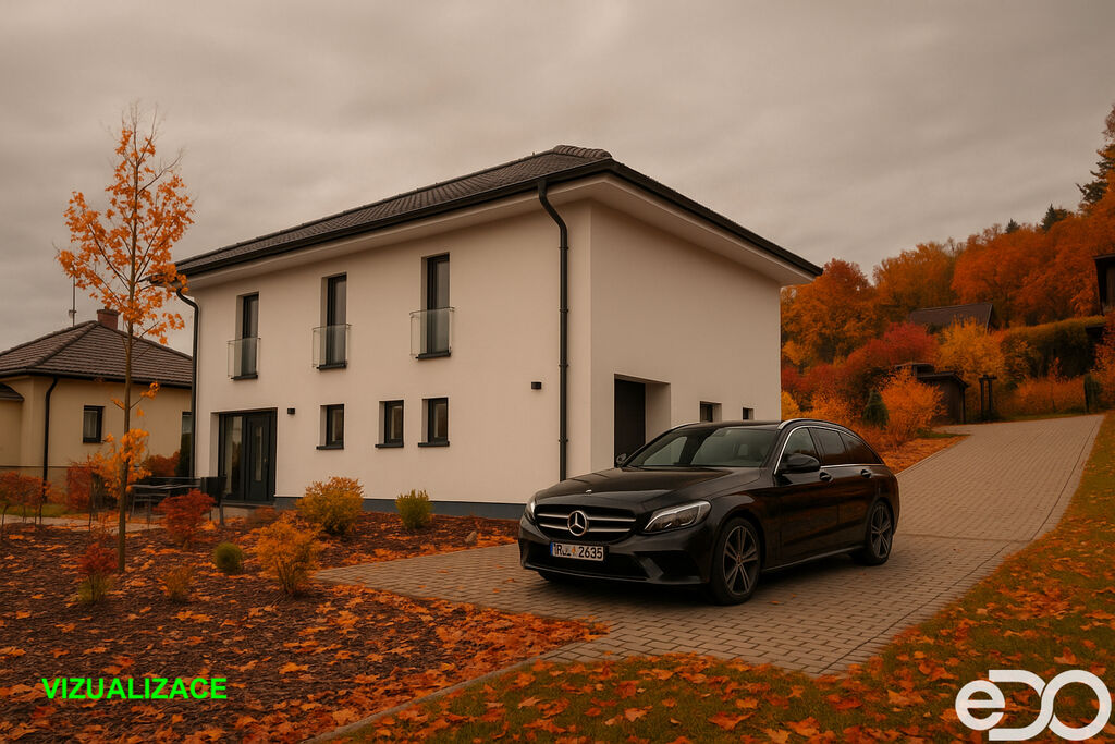 Dům je nízkoenergetický, vytápěný tepelným čerpadlem, s podlahovým topením, rekuperací a elektrickými roletami. Dispozice nabídne prostorný obývací pokoj s výstupem na terasu s krásným výhledem, kuchyňský kout, ložnici, tři další pokoje, koupelnu i technické zázemí. Zahrada je menší než u první varianty, ale stále poskytne dostatek prostoru na posezení, bazén, pěstování i rodinné aktivity – bez nutnosti řešit velký pozemek navíc.