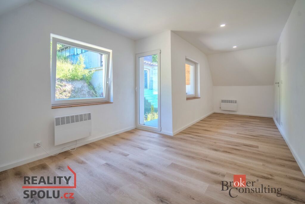 * 1. patro: hlavní ložnice s balkonem, další samostatný pokoj a druhá koupelna se sprchovým koutem a toaletou.