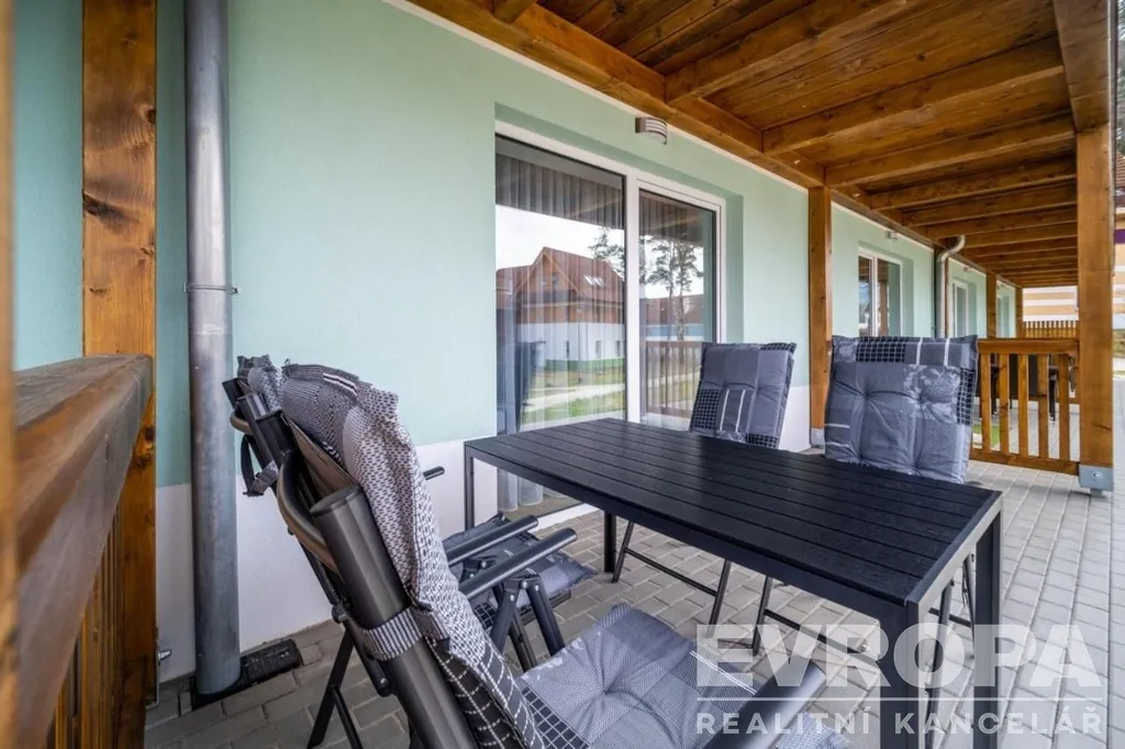 Byt se nachází v přízemí viladomu, kolaudovaného v roce 2021, na krásném místě v areálu Riviera Lipno, v blízkosti lipenské pláže a docházkové vzdálenosti od turistického centra Lipna nad Vltavou a promenády s restauracemi, kavárnami a obchody. Apartmán se skládá ze vstupní předsíně, prostorného obývacího pokoje, který je rozdělen na jídelní část s kuch. Linkou a část obývací, součástí prodeje je vybavení apartmánu, manželská postel a pohovka, která může po rozložení sloužit jako další 2 lůžka. Navazující kuchyně s barem a barovým sezením je vybavena vším pro pohodlné vaření a stolování. Spotřebiče (lednice s mrazákem, myčka, el. trouba, sklokeramická varná deska, kávovar na kapsle). Ve vstupní hale je umístěna prostorná šatní skříň a nabízí dostatek úložného prostoru. Obrovskou výhodou je výstup na venkovní terasu 16,5m2, která nabízí posezení venku a pěší vzdálenost od Lipenské přehrady. Koupelna se sprchovým koutem, toaletou a pračkou. Součástí je také vlastní sklep pro uskladnění jízdních kol, lyží, kočárků a vlastní venkovní parkování, na privátním parkovišti před apartmánem.