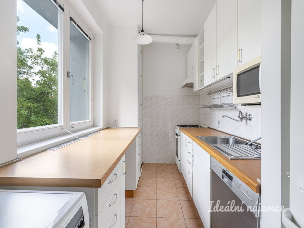 Obývací pokoj je vybaven šatní skříní a nechybí ani praktické úložné prostory pod televizí i nad televizí. Druhý pokoj, který lze využít jako ložnici či pracovnu, je rovněž částečně zařízen – najdete zde šatní skříň a police pro uskladnění věcí. Koupelna je kompletně vybavena – součástí je vana, toaleta, umyvadlo, pračka a koupelnová skříňka umístěná nad umyvadlem. Na chodbě bytu se nachází další praktický úložný prostor, který ocení každý nájemce.