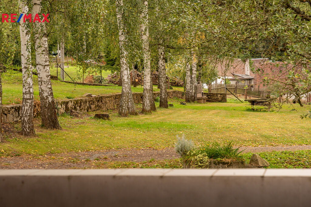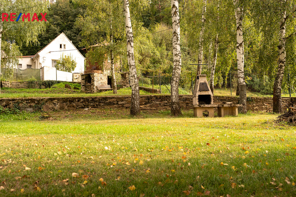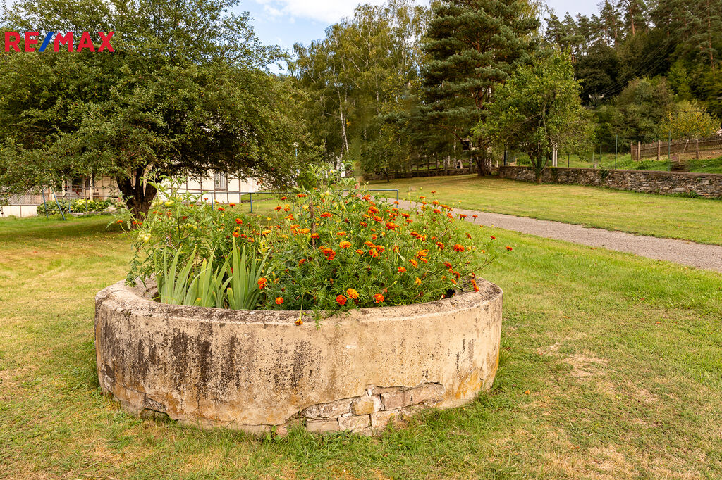 V mírně svažité, udržované zahradě, která má přes 5900 m2 se nachází alej vzrostlých bříz a ovocné dřeviny, dále zpevněné volejablové hřiště, zahradní krb a altán. Celý areál je oplocený a vede jím jednosměrná zpevněná komunikace.