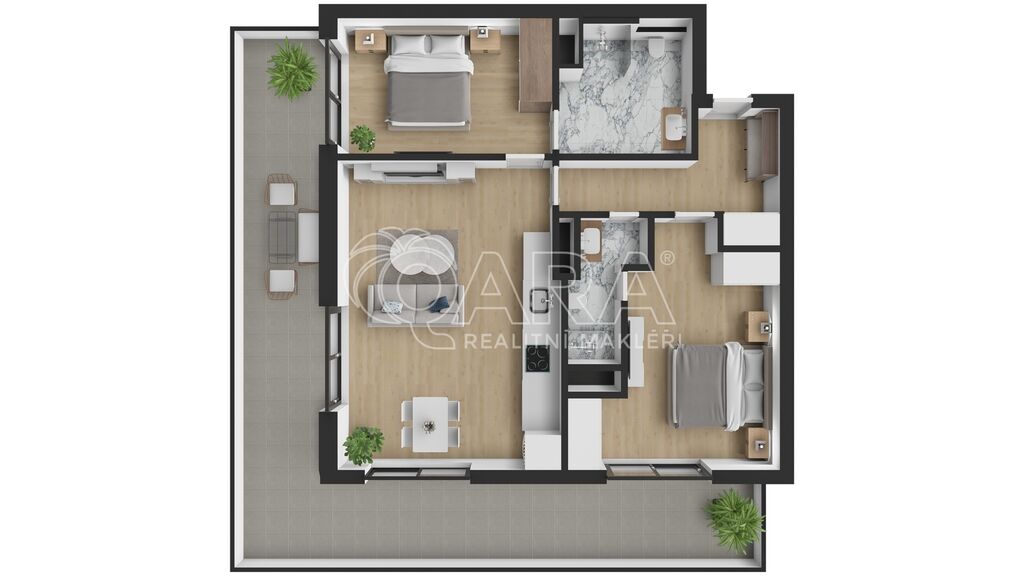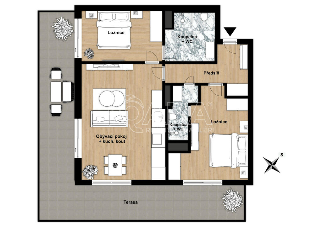 K bytu náleží výjimečná terasa o velikosti 35 m², orientovaná na východ a jihozápad, s velkoformátovou dlažbou (60×60 cm) uloženou na terčích. Terasa je přístupná z každého ze tří pokojů přes francouzská okna a je připravena na pohodlné užívání – je zde vyvedena voda i elektřina.