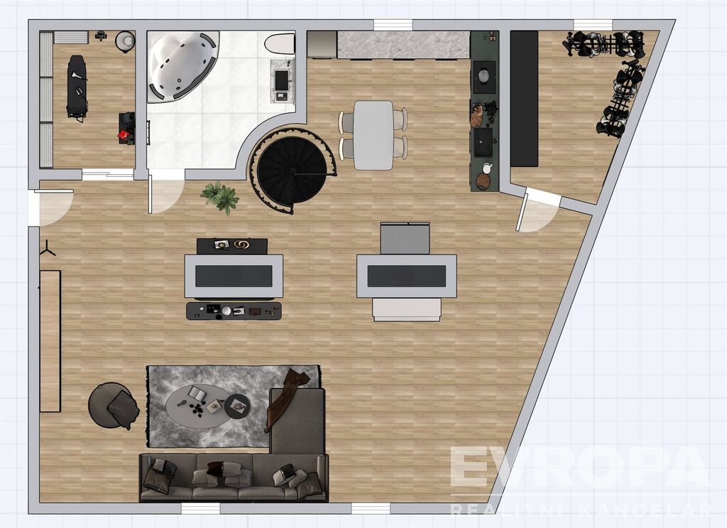 Celková obytná plocha bytu je 117 m². Byt je proveden jako půdní vestavba, takže sestává ze vstupní plochy na úrovni 5tého patra domu, která zahrnuje chodbu, velký obývací pokoj, kuchyň s jídelnou, malý pokoj, koupelnu s wc a technickou místnost. Po točitých schodech se dostanete do mezaninu kde je umístěna ložnice, koupelna a další menší pokoj nyní posilovna. Byt je částečně zařízený zůstane zde kuchyně a vybavení koupelen. Komfort bydlení zvyšuje výkonná klimatizace, nainstalovaná v obývacím pokoji. Byt má vlastní sklepní kóji a sdílenou menší zahradu. Dům nemá výtah.