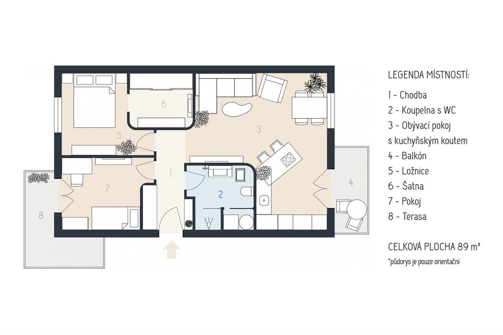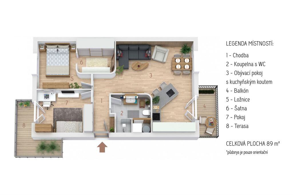 Byt je o celkové užitné ploše 77m2 plus balkón 4,5m2 se vstupem z obývacího pokoje a terasa 7,5m2 se vstupem z ložnice. K bytu dále náleží sklepní kóje přímo na patře a jedno venkovní parkovací místo u hlavního vchodu do domu.