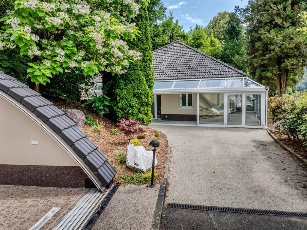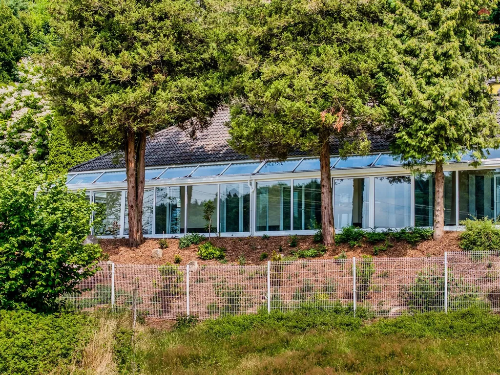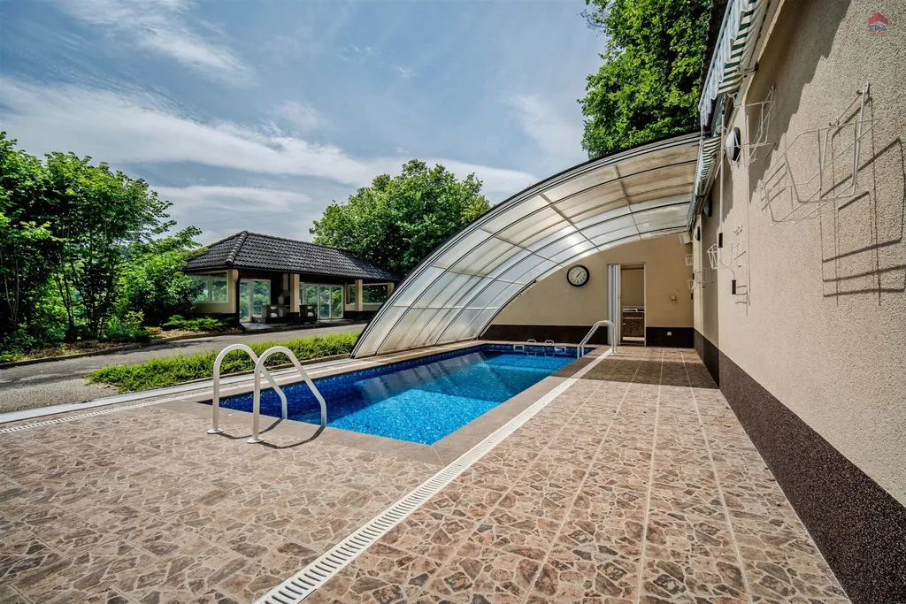 Kolem celého průčelí domu je zimní zahrada z hliníkových profilů a HS portálů. K domu vede vlastní příjezdová cesta ,parkování je vyřešeno pomocí tří parkovacích míst a tří garáží. K domu také patří přístavek s bazénem , vířivkou a sociálním zařízením a pergola s venkovním krbem.