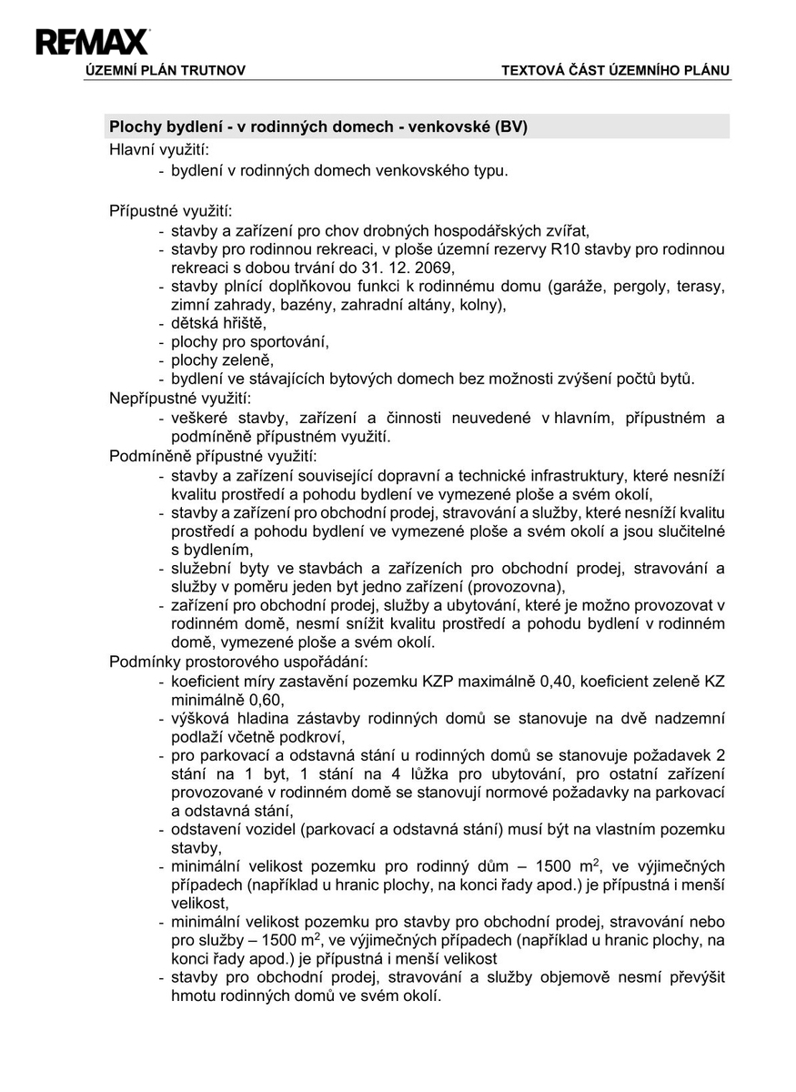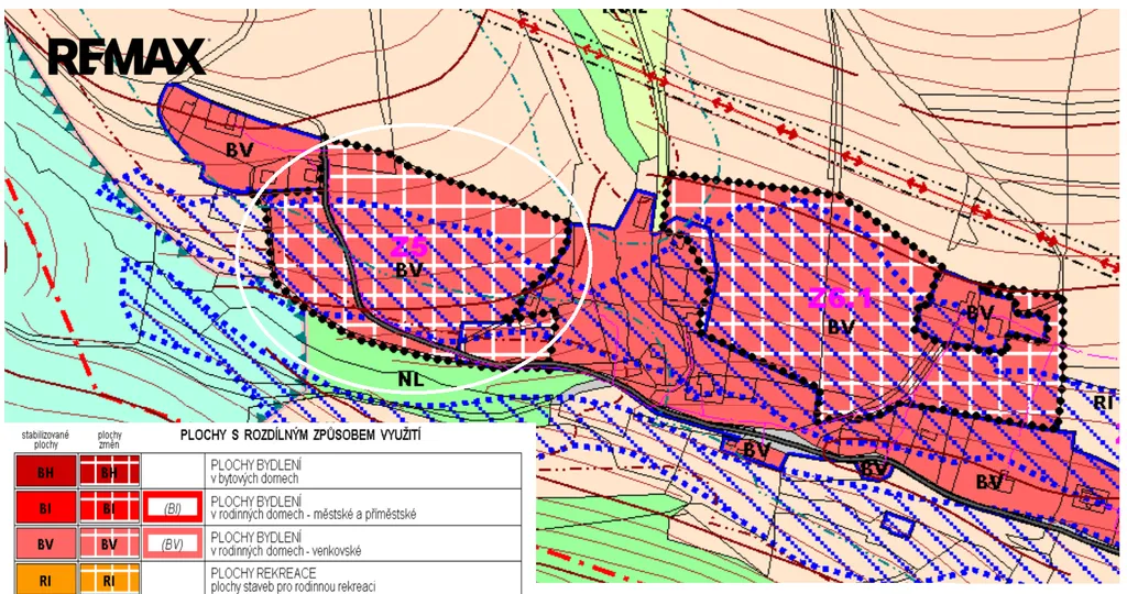Pozemek má rozlohu 20139m², v územním plánu obce spadá do kategorie – plochy bydlení – v rodinných domech – venkovské (BV), což umožňuje výstavbu rodinného domu dle Vašich představ a to, až dvě nadzemní podlaží včetně podkroví. Minimální velikost pozemku pro rodinný dům 1500m2, ve výjimečných případech např. u hranic plochy, na konci řady apod., je přípustná i menší velikost.