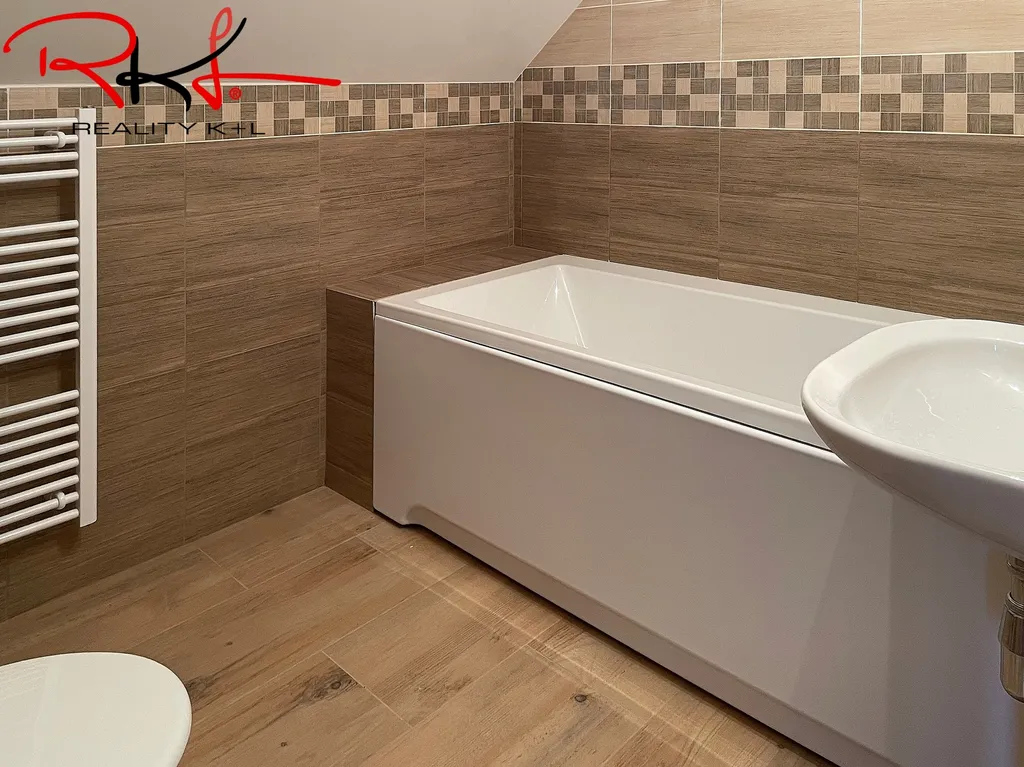 • Chodba a koupelny: keramická dlažba v dekoru světlého dubu