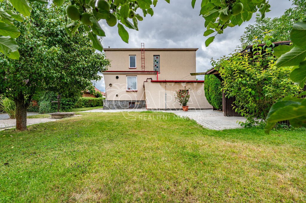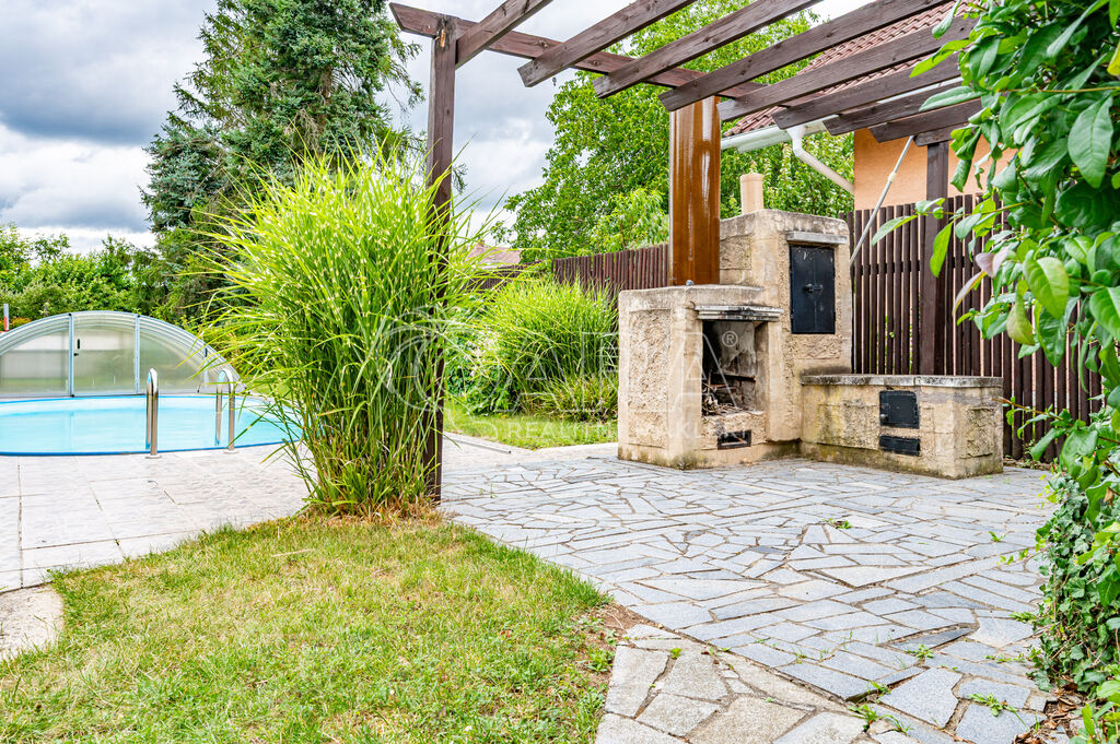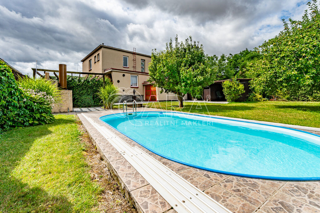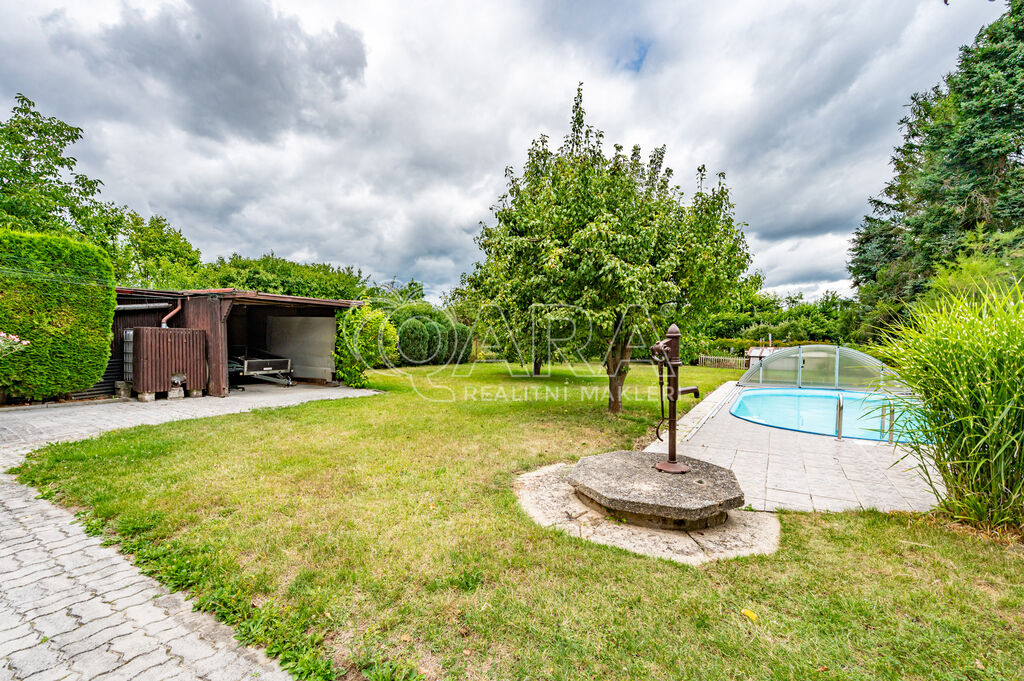 A co exteriér? Téměř 1000 m² zahrady se vzrostlými stromy, udržovaným trávníkem a příjemným zastřešeným bazénem vytváří ideální prostředí pro letní pohodu, rodinné oslavy i chvíle klidu uprostřed zeleně.