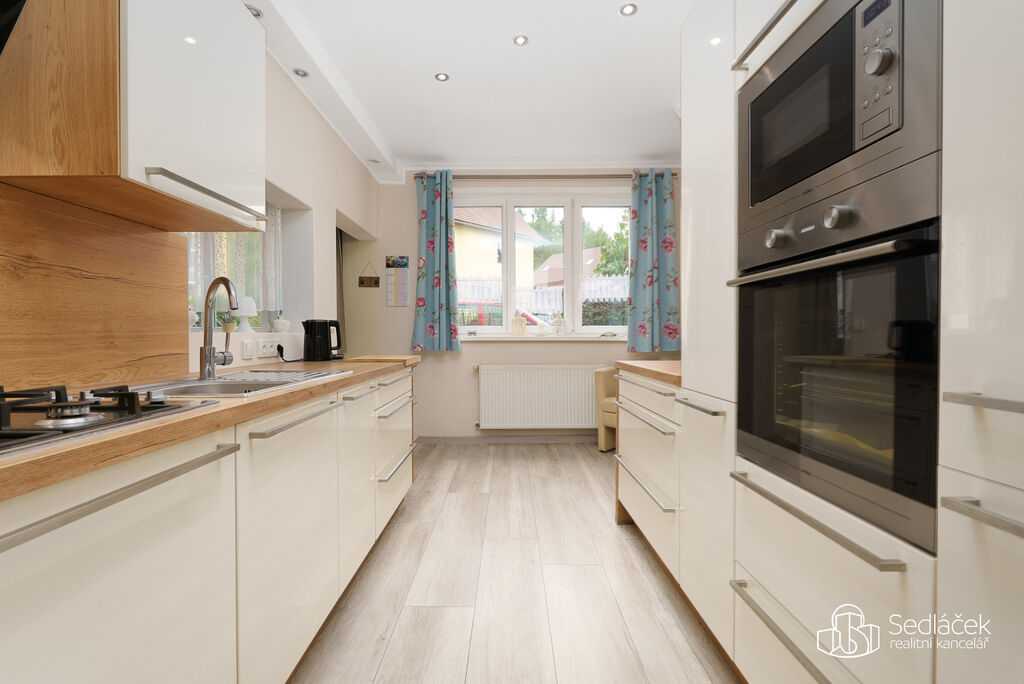 - V přízemí najdete vstupní předsíň, moderní koupelnu po kompletní rekonstrukci, novou kuchyni s vestavnými spotřebiči a obývací pokoj, který čeká na úpravy podle představ nových majitelů a technickou místnost.