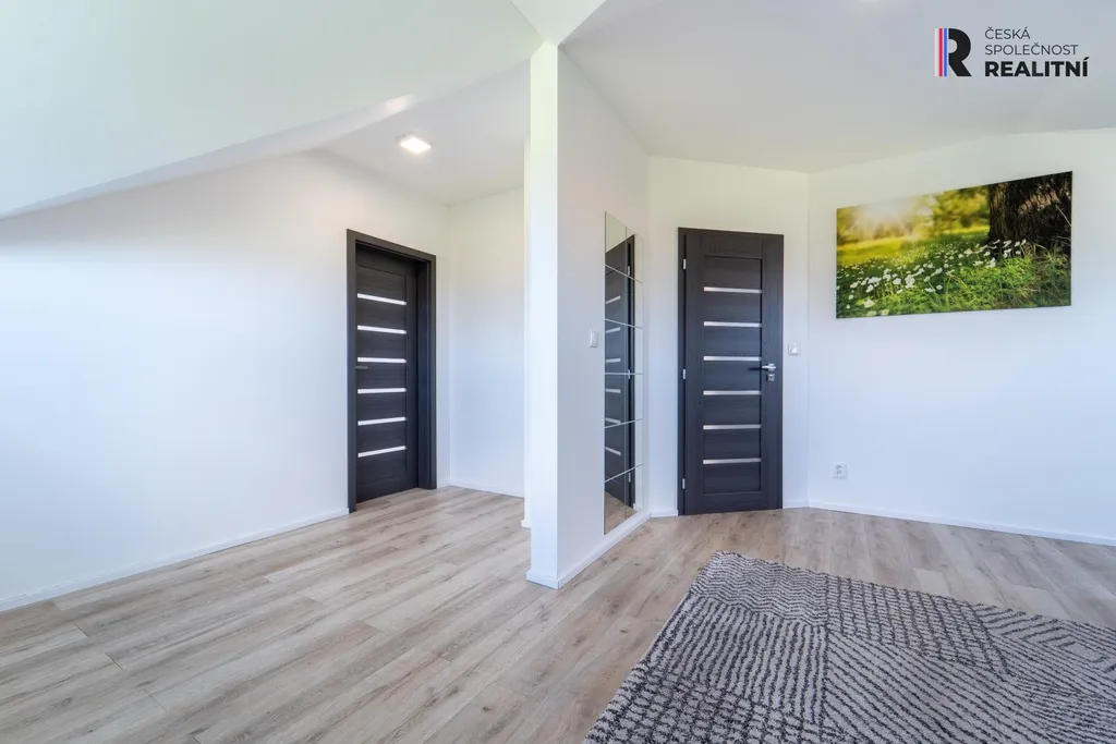 V patře najdete dvě ložnice s nádherným výhledem do okolní krajiny. Nechybí ani praktická šatna, kterou je možné dle potřeby přestavět na třetí pokoj. Součástí patra je také hlavní koupelna, která nabízí vše potřebné pro pohodlí každodenního života, rohovou vanu, umyvadlo se zrcadlem, skříňky a místo pro pračku.