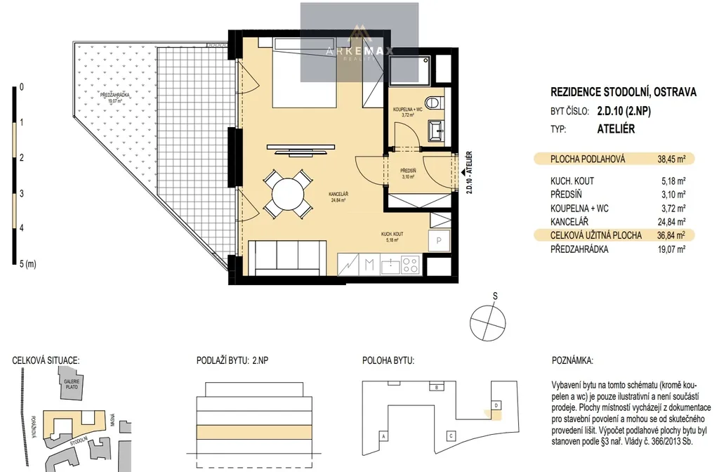 Jednotka je vedena jako ateliér (2+kk) o předpokládané podlahové ploše 38,45 m² a nachází se ve 2. nadzemním podlaží.