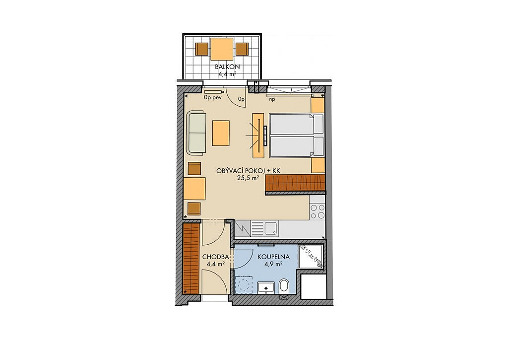 Nabízíme nový byt 1+kk o podlahové ploše 36,30 m² s balkónem (4,40 m²) ve zcela novém projektu Nový Opatov developerské skupiny FINEP.