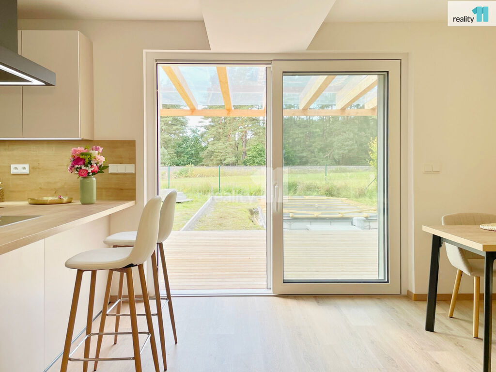 Již při vstupu Vás okamžitě zaujme prostorné, slunné zádveří a otevřený koncept obývacího pokoje propojeného s na míru realizovanou kuchyní. Kuchyňská linka je vybavena všemi moderními spotřebiči – indukční varnou deskou, zabudovanou troubou, mikrovlnkou, myčkou, prostornou lednicí s mrazákem – a nechybí ani stylový kuchyňský ostrůvek, kolem kterého se bude odehrávat život celé rodiny. Světlá podlaha a velká okna vnášejí do domu radostnou atmosféru a propojují interiér se zelení za okny.