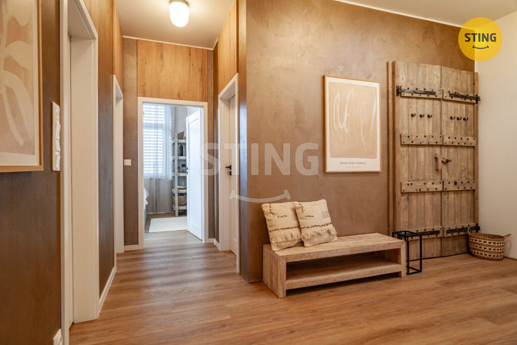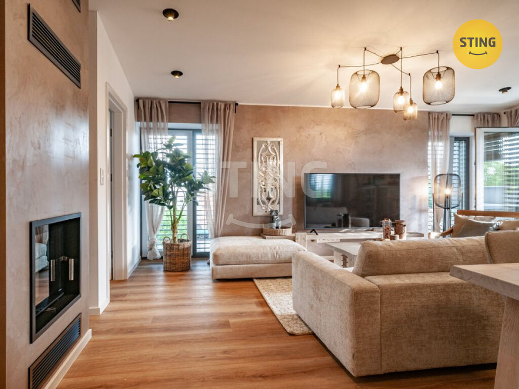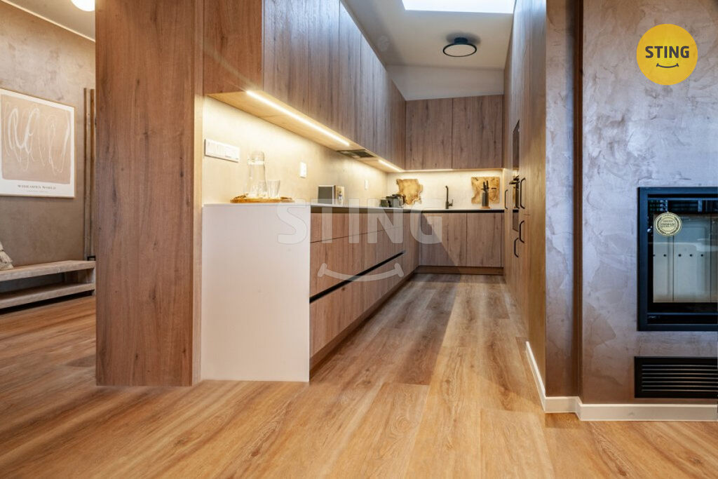 Byt o dispozici 4+kk se nachází v posledním podlaží elegantního, kompletně zrekonstruovaného bytového domu. Jeho dominantou je otevřený obývací prostor s krbem, který přirozeně navazuje na plně vybavenou kuchyň s moderními spotřebiči.