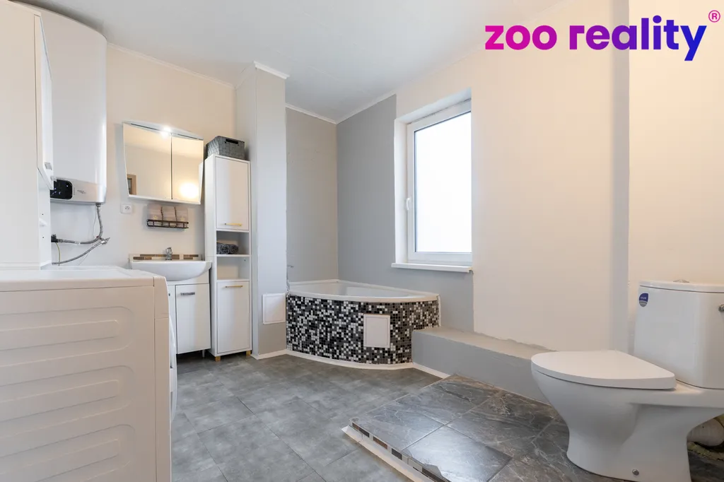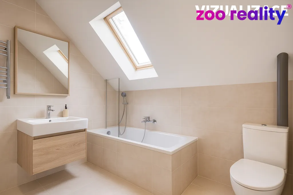 V přízemí najdeme vstupní předsíň, ložnici, koupelnu s toaletou, rohovou vanou a dostatečným prostorem pro pračku a sušičku, dále pak obývací pokoj spojený s kuchyňským koutem a vstupem na zahradu, který je ideální pro rodinné posezení a trávení volného času. V patře pak je myšleno na další koupelnu, kterou si můžete obložit dle vlastního vkusu (nabízíme foto s vizualizací) a dále jsou tu dva samostatné pokoje. Vytápění domu je řešeno elektrickými panely a krbovými kamny na dřevo s výměníkem, které zajistí příjemné teplo během chladných měsíců, ohřev vody řešen elektrickým bojlerem. O odpadní vodu se postará samostatná čistička.