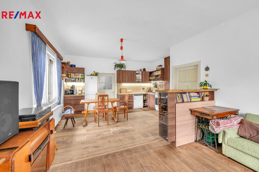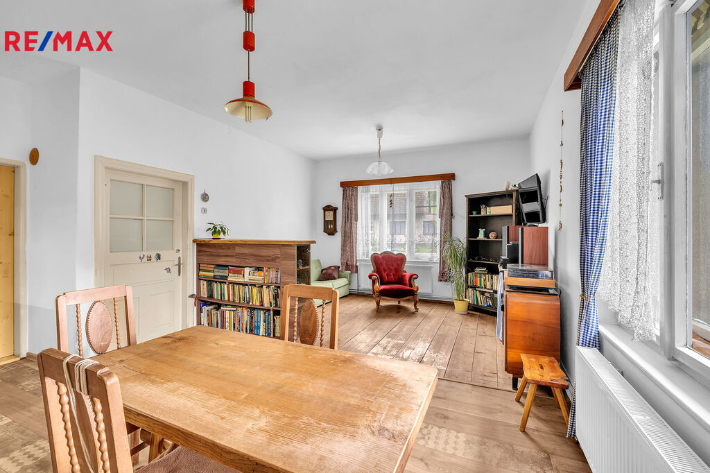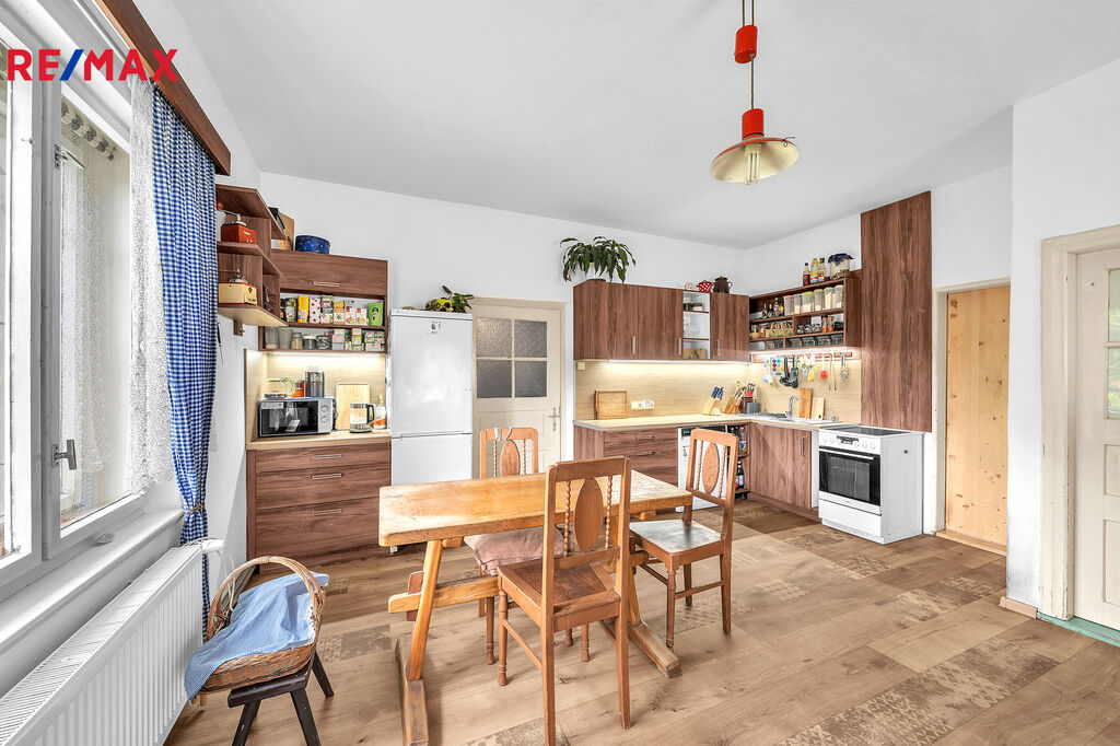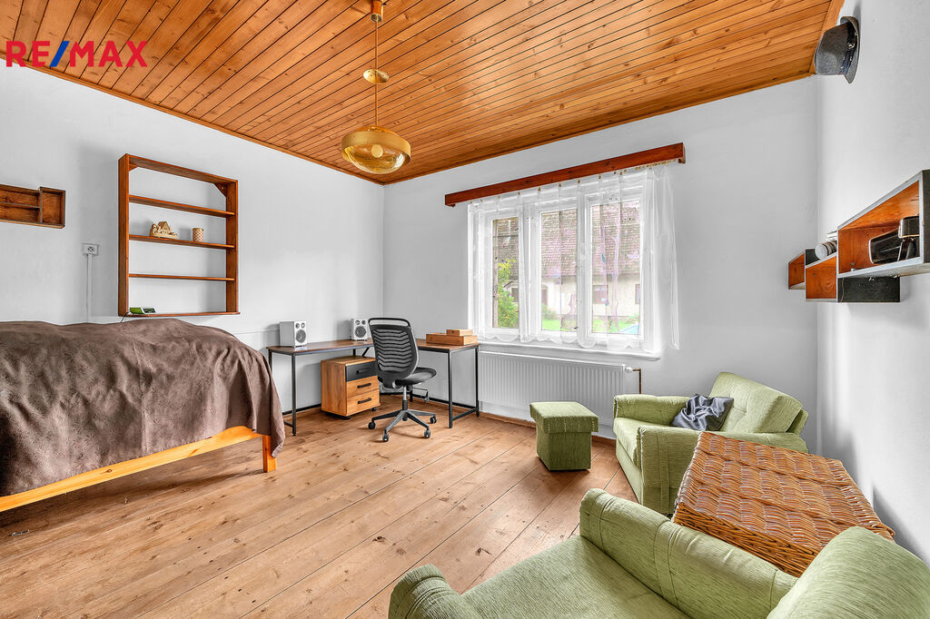Ke koupi Vám tu nabízím rodinný dům s pozemkem o celkové výměře 942 m2. Zastavěná plocha domu je 318 m2. Na obytnou část připadá zhruba 134 m2, kdy užitná plocha je zhruba 110 m2. Tvoří ji kuchyň s jídelnou a odpočinkovou částí, 3x pokoj, koupelna, chodba a prostorná spíž. Obytná část je přízemní. Zbylou část domu tvoří stodola, která má 2 podlaží a dvoupodlažní půda nad obytnou částí, která je z větší části zděná a zbytek stavby je roubený, dřevěný. Dům je částečně podsklepený.