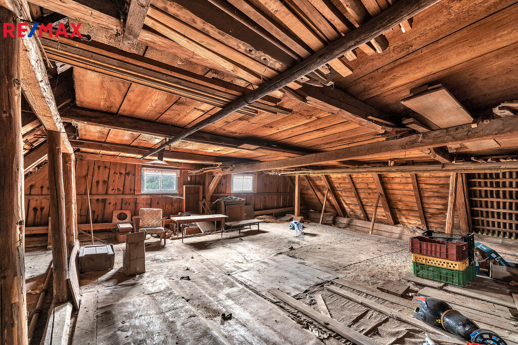Půda a stodola Vám nabízí širokou škálu využití - ať už pro skladování, kutilství a nebo je i možnost přebudovat vše na obytné prostory.