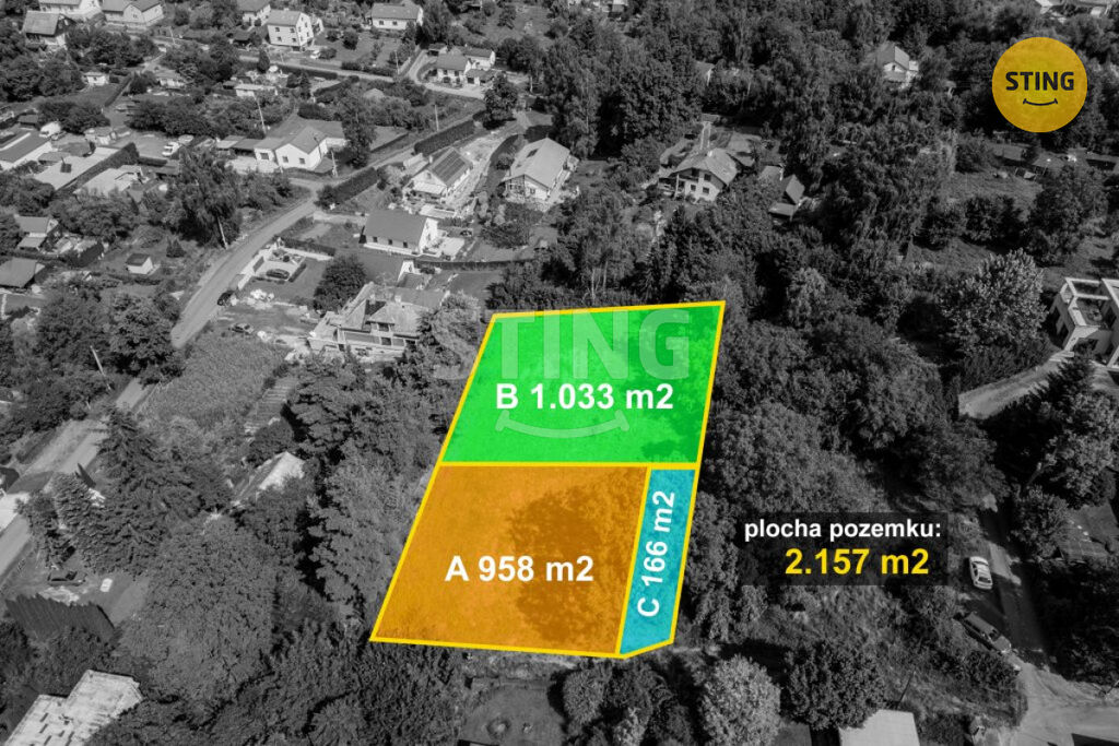 Parcela A má výměru 958 m2 + parcela B má výměru 1 033 m2 + parcela C má výměru 166 m2