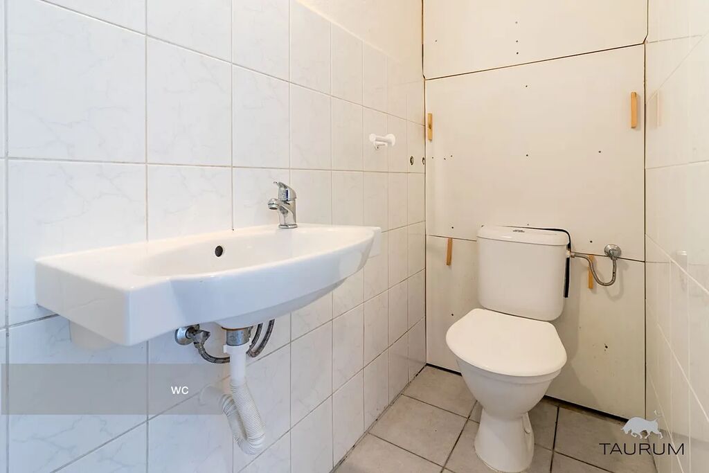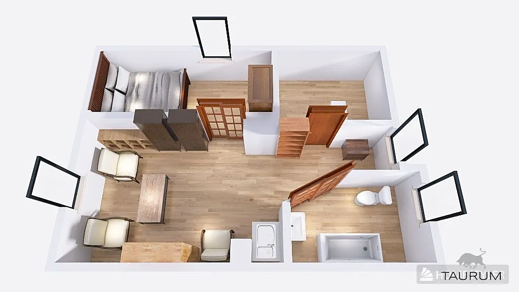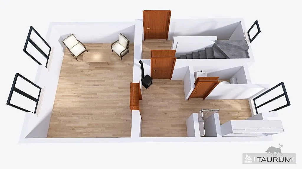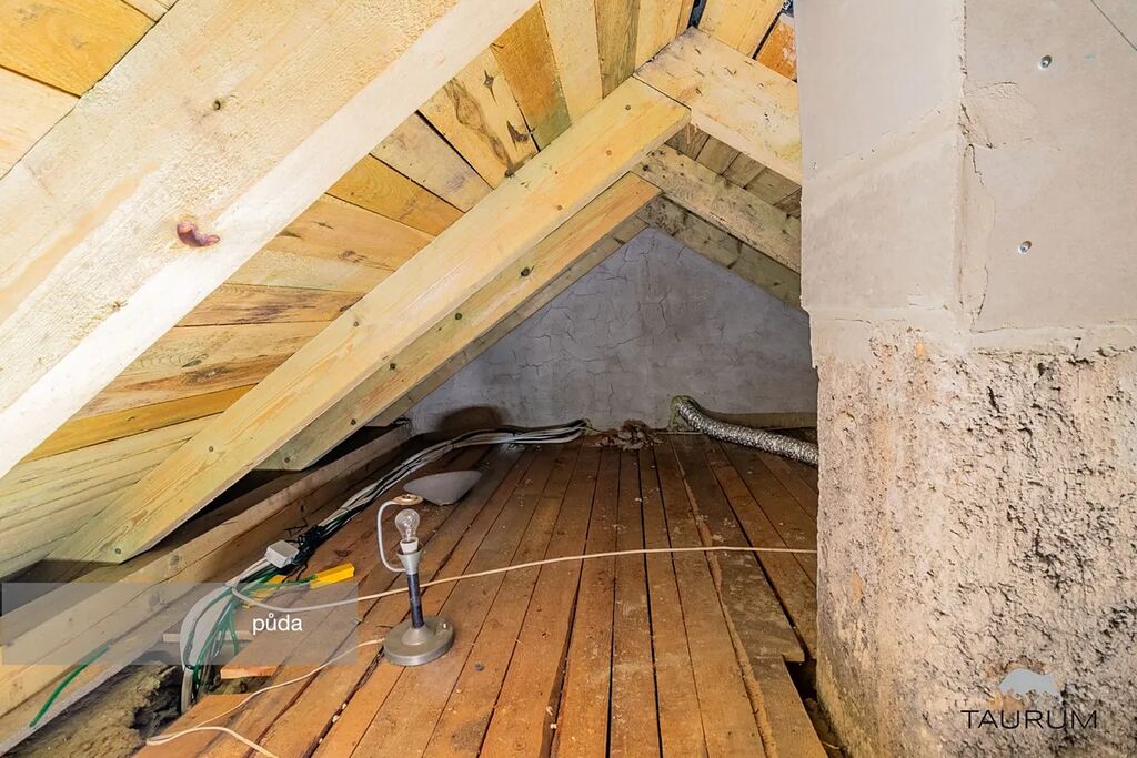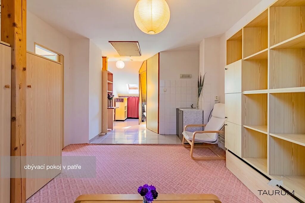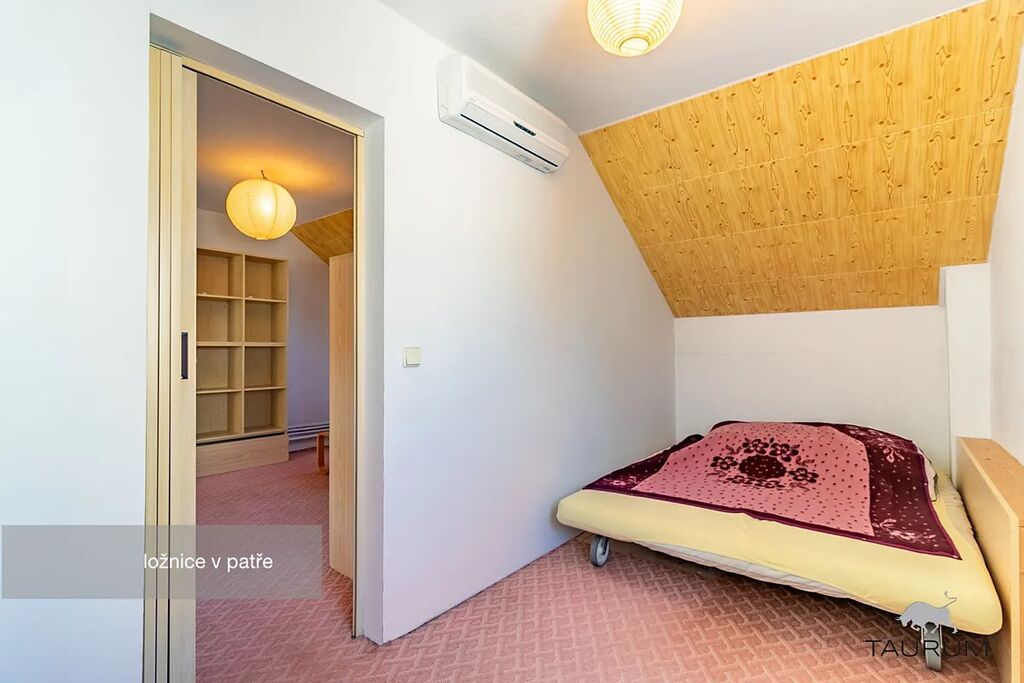 Dvoupodlažní, podsklepený dům s dispozicí 3+0 – kuchyně zatím není plnohodnotně vyřešená, proto zatím bez kuchyňské části. V přízemí se nachází zádveří, které odděluje hlavní vchodové dveře od zbytku interiéru. Ze zádveří vedou schody dolů do technické místnosti a dále do sklepa. Zároveň se ze zádveří dostaneme do prostoru s kuchyňským koutem, sprchovým koutem a samostatným WC. Z tohoto prostoru vedou terasové dveře na pozemek. Dále je v přízemí prostorný obývací pokoj. Celé přízemí sloužilo pro hosty. Po schodech se dostaneme do patra, kde se nachází koupelna s WC, obývací pokoj a menší ložnice. V patře je také půdní výlez, odkud vedou stahovací schody do půdních prostor sloužících k uskladnění věcí. Na pozemku je postavený zděný přístřešek pro auto, za nímž se nacházejí prostory pro uskladnění nářadí a zahradní techniky.