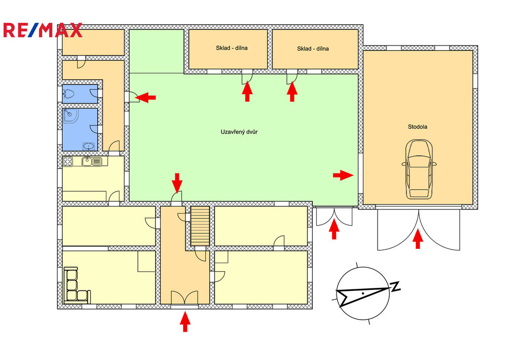 Součástí nemovitosti je samostatně stojící stodola přístupná ze dvora i ulice (vnitřní rozměry cca 6,8 x 9,2 m), která uzavírá prostorný dvůr (cca 7,8 x 14,6 m) a zajišťuje naprosté soukromí. Stodola je určena k rekonstrukci a nabízí široké možnosti využití – dílna, ateliér, podnikání nebo další obytný prostor. Ze dvora je přístupná zděná dílna se skladem.