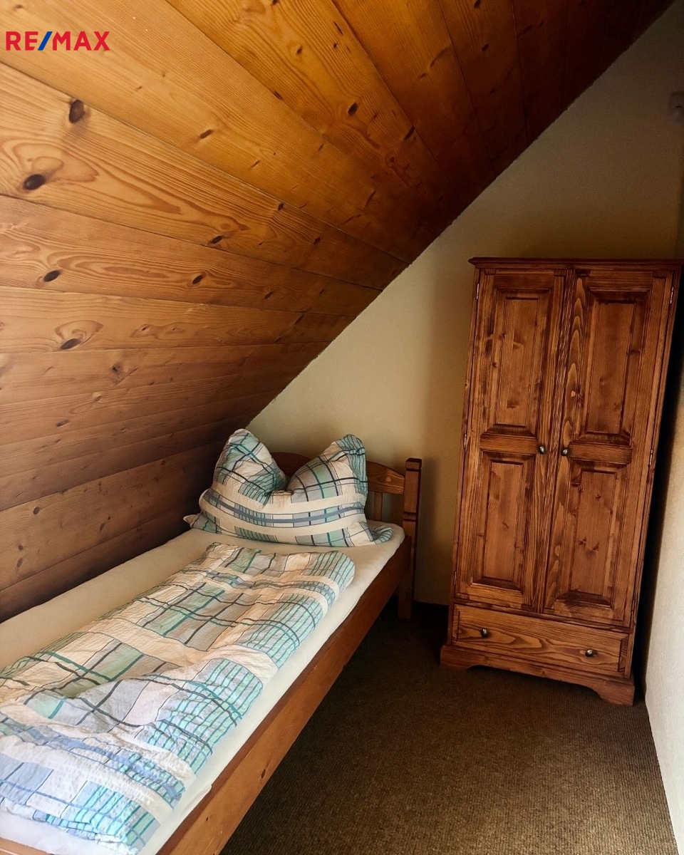 Byt má rozlohu 120 m² a je kompletně vybavený včetně spotřebičů i nábytku. V přízemí se nachází prostorná společenská místnost s krbem a kuchyňským koutem (lednice, mrazák, dřez, elektrický vařič). V patře jsou dvě ložnice, každá s manželskou postelí a samostatným jednolůžkem, a koupelna s vanou.