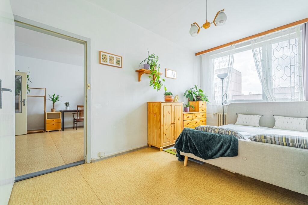 Díky vyššímu podlaží nabízí byt krásný výhled do zeleně, a to jak z obývacího pokoje, tak z ložnice. Velká plastová okna jsou osazena izolačními dvojskly, která zajišťují komfortní tepelně i akusticky izolační vlastnosti a poskytují dostatek denního světla. Fond oprav činí 3.337.- Kč.