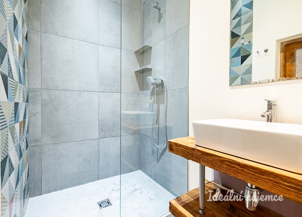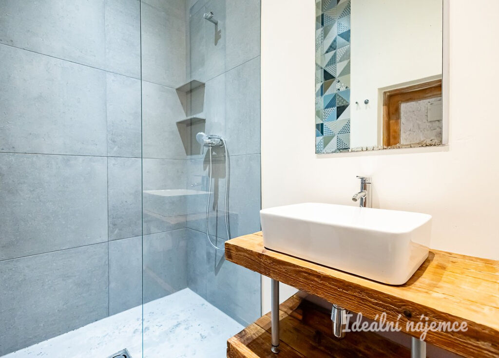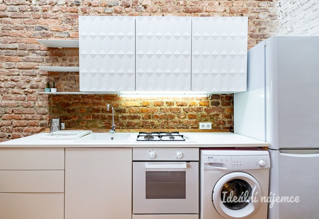 Byt se nabízí nevybavený. Kuchyně disponuje lednicí s mrazákem, elektrickou troubou, plynovým sporákem a pračkou. Obývací část je zařízena TV, taburetem a lampou. Na patře je komoda. V koupelně je sprchový kout, umyvadlo, zrcadlo a koupelnová skříňka. Toaleta je umístěna samostatně.