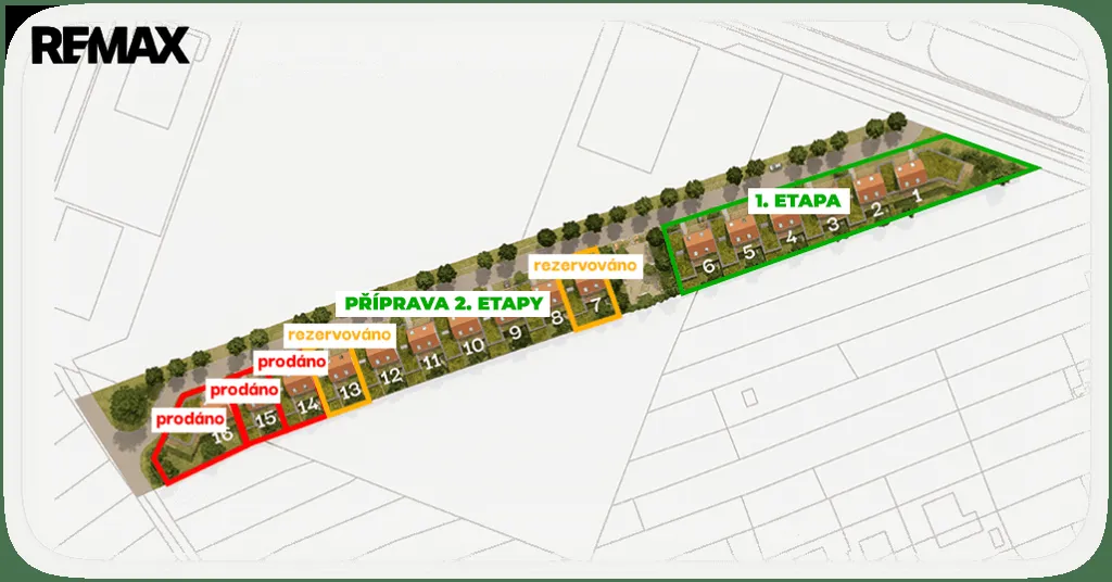 Výstavba byla zahájena 3/2024. Plánované dokončení staveb v rámci první etapy šesti domů je na konci roku 2026. V rámci projektu pro vás připravujeme a rádi vám nabídneme zvýhodněné úvěrování, které je připravené tomuto projektu na míru naším finančním poradcem po konzultaci a upřesnění vstupních informací s jednotlivými zájemci o koupi.