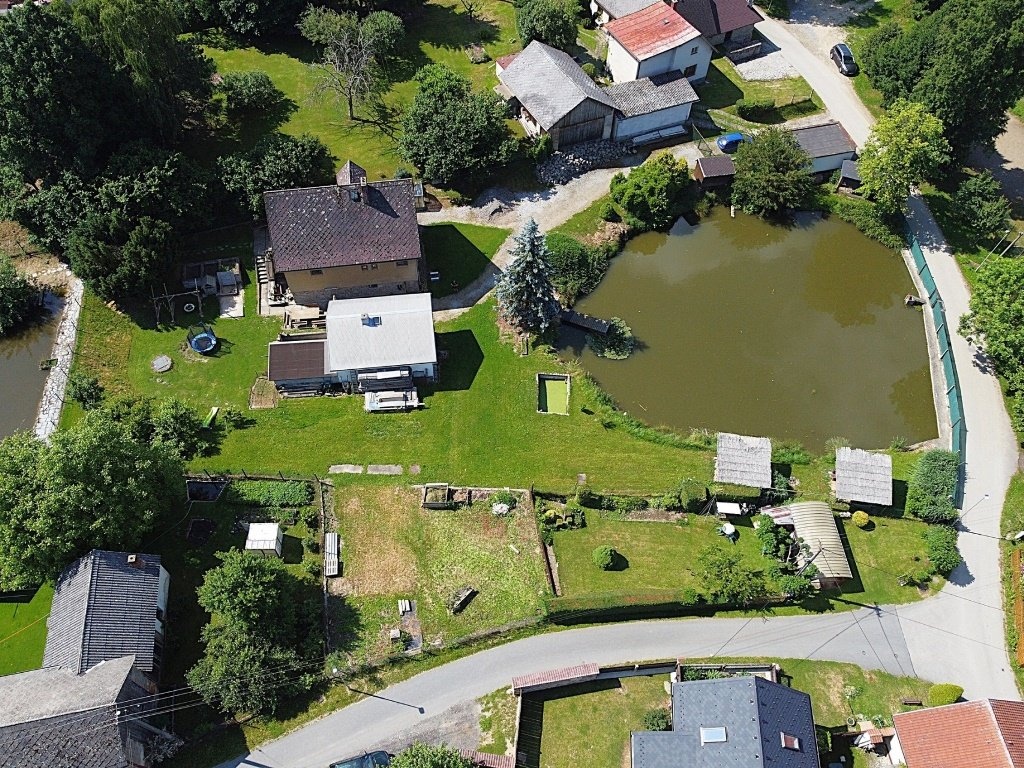 Dům je celopodsklepený a částečně zrekonstruovaný. V přízemí domu je prostorná předsíň, kuchyň spojená s obývacím pokojem, koupelna se sprchovým koutem, samostatné WC, komora. V patře jsou tři pokoje, koupelna s podlahovým topením a WC, lodžie. Ve sklepě domu je společenská místnost pro posezení vybavená kamny, menší kuchyňskou linkou s dřezem, WC, sprchový kout a větší technická místnost, kterou lze využít k uskladnění sezónních věcí. Vedle domu je samostatně stojící budova s garáží a prostory pro malé hospodářství. Dům stojí na pozemku o celkové výměře 4193m2 se třemi kaskádovitě vybudovanými rybníky.