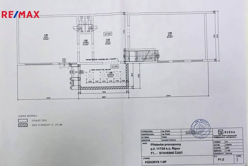 Přízemí: dvě haly 89 m² a 77 m² propojené přes výdejní sklad 45 m², ze kterého je vstup do zázemí pro zaměstnance (šatna, toalety, kuchyňka).