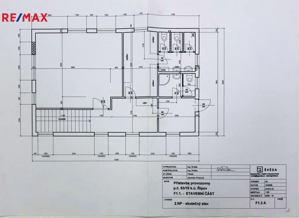 Patro: dílna 31 m², navazující šatna pro zaměstnance 14 m², toalety se sprchou 9 m², chodba se schodištěm 22 m² a kancelář 8 m² se zázemím (toaleta a sprcha) 5 m².