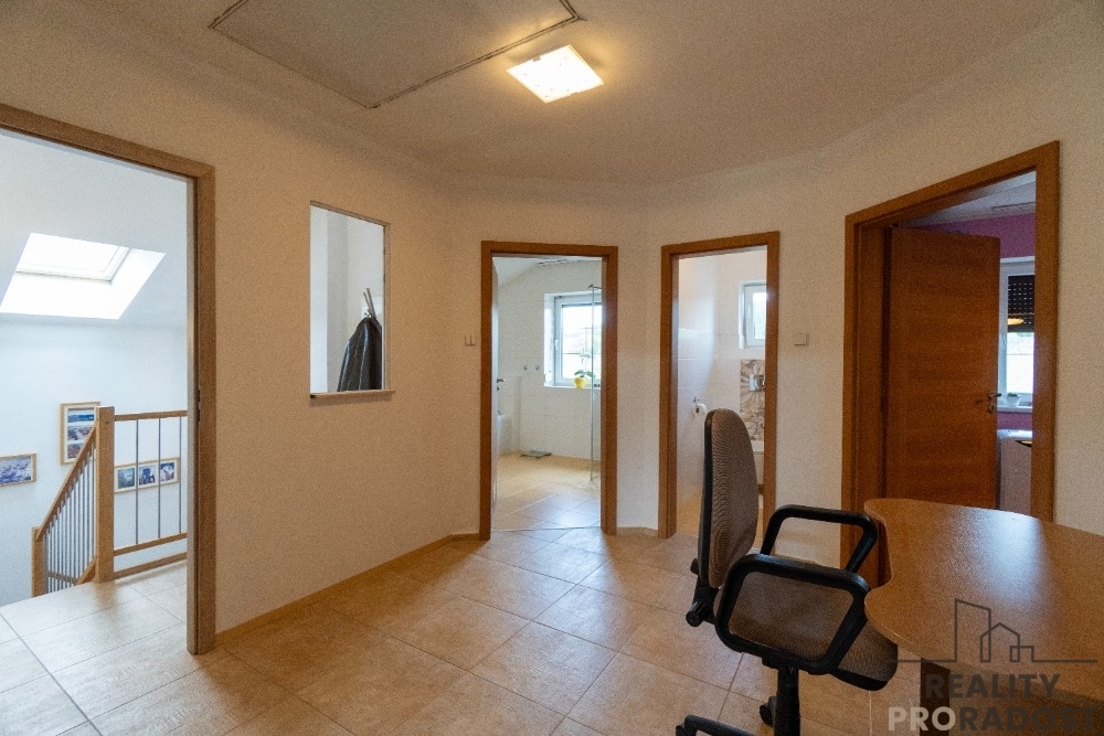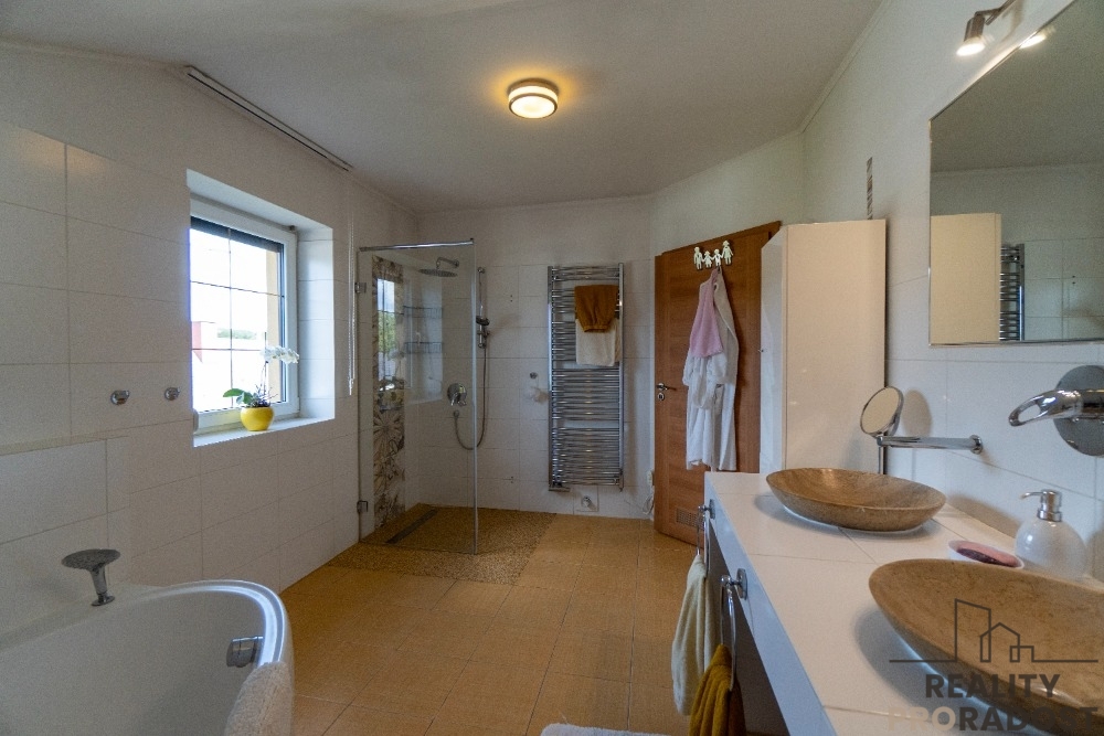 Nabízíme vám exkluzivně ke koupi krásný rodinný dům v obci Staré Hrady, nacházející se nedaleko města Jičín. Dům byl postaven v roce 2010. Jedná se o zděnou stavbu se zastavěnou plochou a nádvořím 165 m2. Za domem se nachází terasa a velká udržovaná zahrada s ovocnými stromy o ploše 1450 m2, kterou protéká malý potůček. Tato zahrada, částečně osázená vysokými stromy, je velmi působivá a splňuje vysoké nároky na relaxaci v klidném prostředí. Dům není podsklepen, má 3 podlaží, z toho jedno podlaží je půdní prostor. Topení je plynovým kotlem Viessmann a také krbem na tuhá paliva obloženým z mastku - 4 h výdrž tepla po vyhasnutí. Ohřev vody zajišťuje plynový bojler. V přízemí podlahové topení, v patře radiátorové vytápění kromě koupelny a WC, kde je rovněž podlahové topení. V přízemí se nachází předsíň, chodba, kuchyň s jídelnou, špajzka, obývací pokoj, koupelna se sprchovým koutem a WC, síň se saunou, zimní zahrada, technická místnost s prádelnou a garáž. V patře se nachází předsíň, ložnice, dětský pokoj, obývací pokoj s kuchyní a balkonem, WC, koupelna s vanou a sprchovým koutem. Vodovod obecní, odpady septik. V každé s kuchyní je myčka, sporák indukce, digestoř, lednice s mrazákem. V kuchyni v přízemí je trouba vestavěná. Dům má centrální vysavač, žaluzie, předokenní rolety. Internet - wifi. Před domem je možno na vlastním pozemku parkovat navíc až 3 auta. Střecha sedlová, střešní krytina Bramac, termofasáda 10 cm, okna plastová dvojskla, podlaha marmoleum click v imitaci parket. Dům si můžete celý prohlédnout ve video prohlídce a interiér v 3D 360 °prohlídce, stačí kliknout na fotku, kde je napsáno spustit prohlídku. Pokud by se vám to nezobrazilo nebo realitní server prohlídku nepodporuje, napište mi a já vám pošlu rád odkaz. V obci Staré Hrady se nachází zámek, hrad, restaurace. Autobusová zastávka je cca 100 m od domu a vzdálenost od městečka Libáň je 1 km, kde je školka, škola, pošta, restaurace, obchody. V okolí obce je spousta turisticky zajímavých míst - Prachovské skály, zámek Dětenice , Šolcův statek, hrad Kost, Vilémův mlýn a další. V okolí jsou cyklostezky a běžkařské stopy. Města v okolí jsou vzdálená - 15 km Jičín, Mladá Boleslav 27 km, Nymburk 30 km, Poděbrady 36 km, Praha Černý Most 70 km. Doporučuji vám vřele prohlídku a možnost výhodnějšího hypotečního financování koupě prostřednictvím profesionálního finančního partnera. PENB je třída B, velmi úsporná.