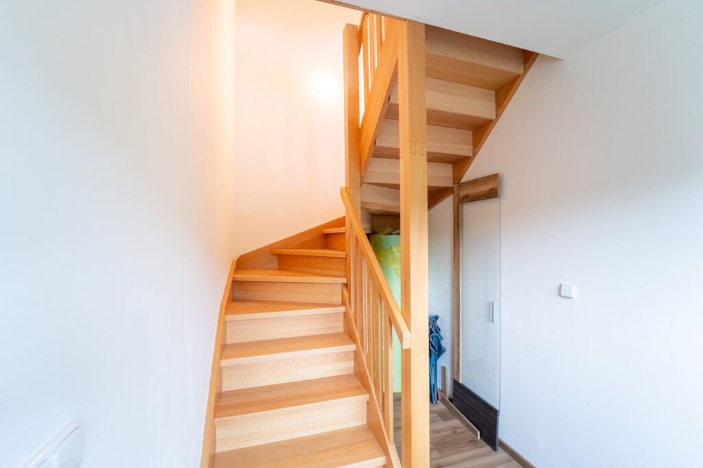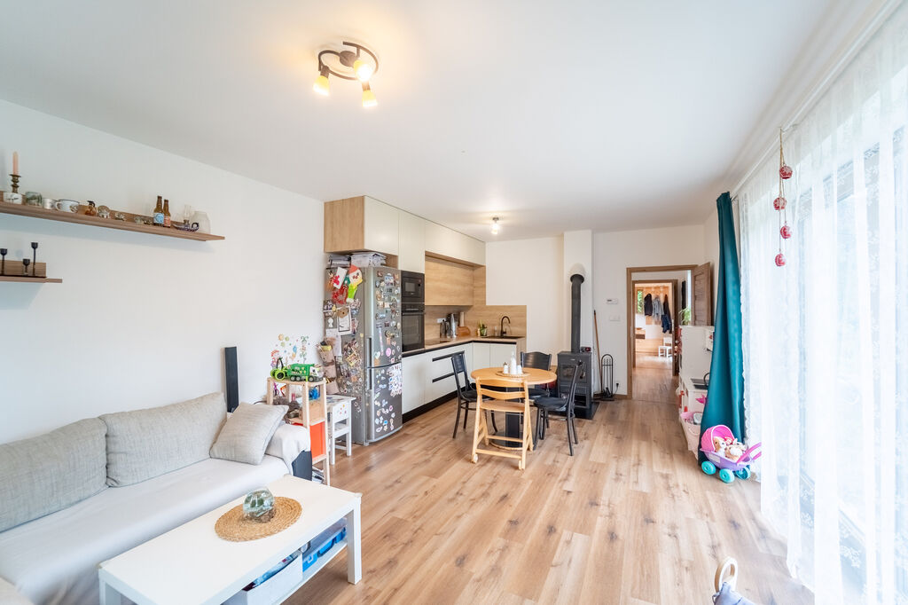 V přízemí se nachází vstupní předsíň, prostorná hala, koupelna a světlý obývací pokoj s kuchyňským koutem. Dominantou obývací části jsou krbová kamna s výměníkem, která zajišťují útulnou atmosféru a příjemné teplo v celém domě. Do patra vedou elegantní schody, odkud se vstupuje do ložnice, dětského pokoje a prostorné pracovny.