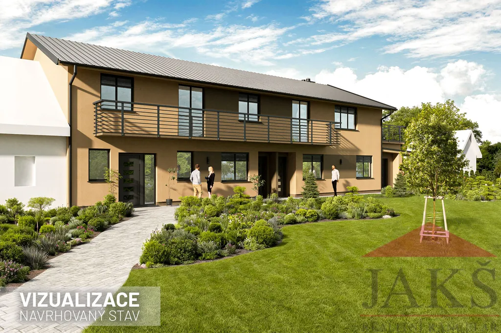 Apartmán/byt č. 1 o dispozici 2+kk s terasou, skladem a parkovacím místem na oploceném pozemku s komunitní zahradou se skleníkem, trampolínou a posezením.