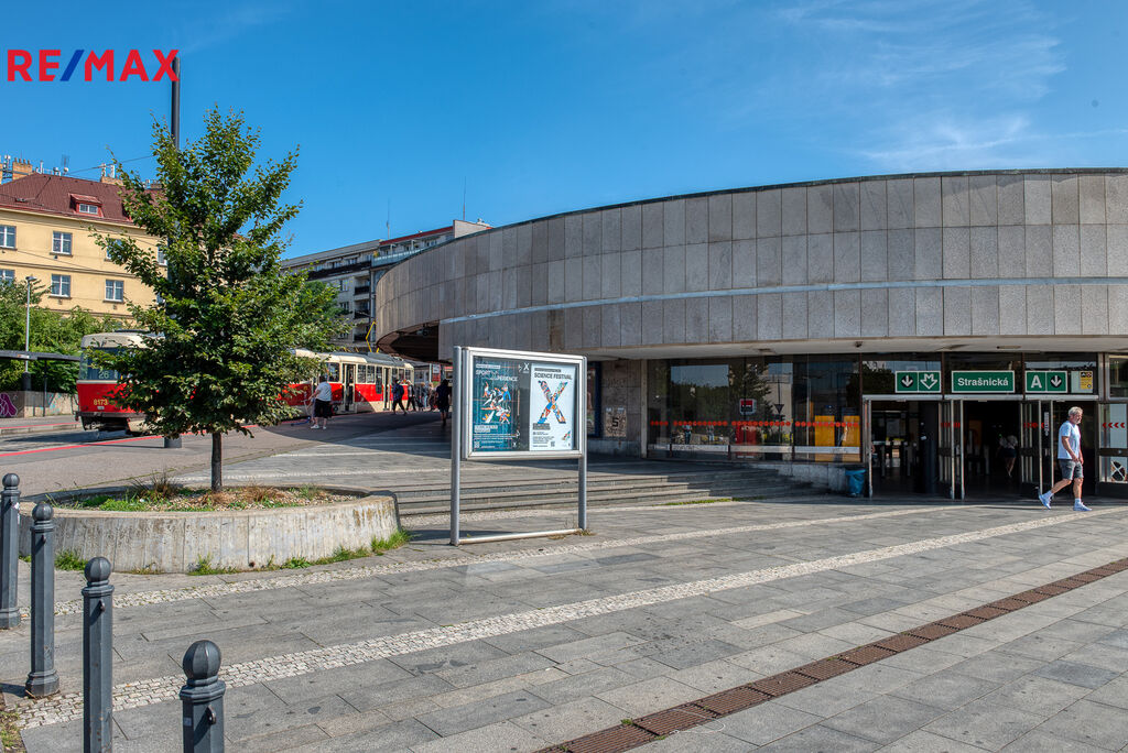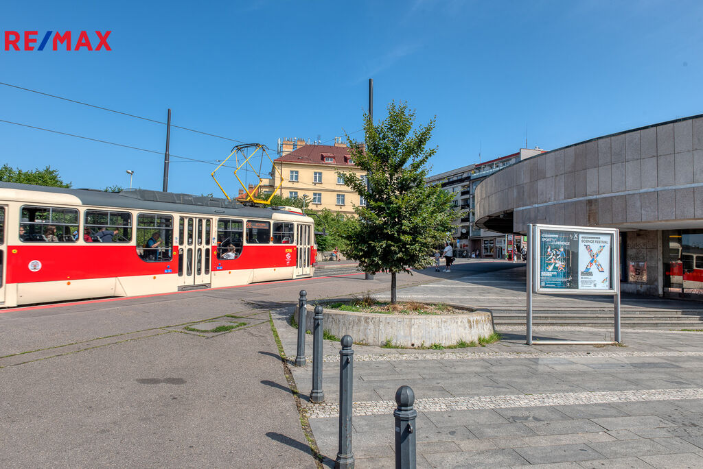 Stanice metra, tramvajová zastávka (linky 7, 19, 26, noční 91) i autobusové spojení (154, 175, 188, noční 901 a 906) jsou vzdáleny 150 metrů.