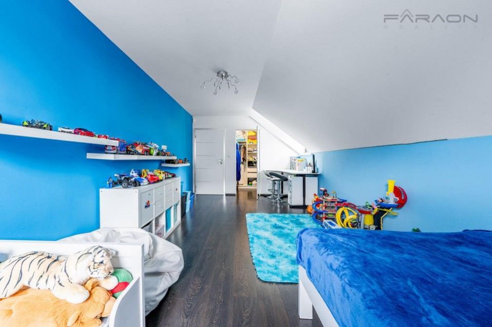 Vytápění domu zajišťuje zcela nové moderní tepelné čerpadlo a plynový kotel s podlahovým vytápěním v přízemí. Okna jsou plastová s hliníkovými rámy a elektrickými žaluziemi. V domě jsou tři prostorné vestavěné šatny a dvě koupelny vybavené luxusními prvky, včetně sauny, hydromasážní vany a vyhřívací lavice ve sprše. Exteriér doplňuje vyhřívaný a zastřešený bazén o rozměrech 6x3 metry a dětský domek o velikosti cca 25 m. Dům je připojený na městský vodovod, kanalizaci.