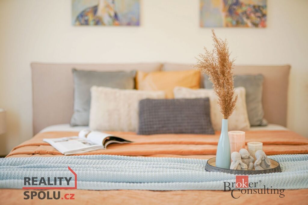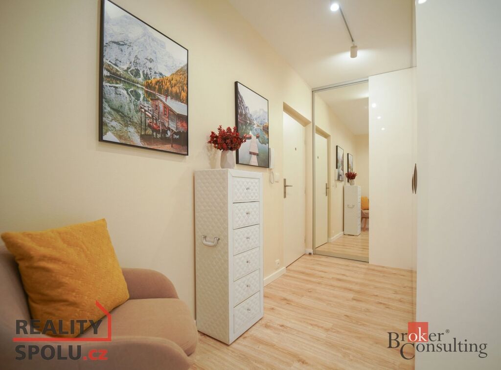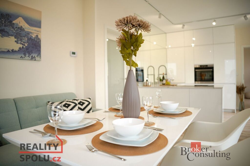 Do bytu vcházíte chodbou se zabudovanými šatními skříněmi a vstupem do šatny. Dále se dostáváme do prostorné a plně vybavené kuchyně s jídelním koutem. Kuchyň má moderní kuchyňskou linku s oboustranně lakovanými skříněmi, včetně zabudovaných značkových spotřebičů nevyšší řady AEG. Na kuchyň navazuje obývací pokoj. Z kuchyně, obývacího pokoje i ložnice je výstup na terasu. Z chodby je přístupná ložnice s lakovanými šatními skříněmi a moderním vnitřním vybavením, koupelna se sprchovým koutem a samostatné WC. Byt se nabízí včetně pračky AEG, sušičky AEG a TV s 5G internetem TV O2 a veškerým vybavením.
