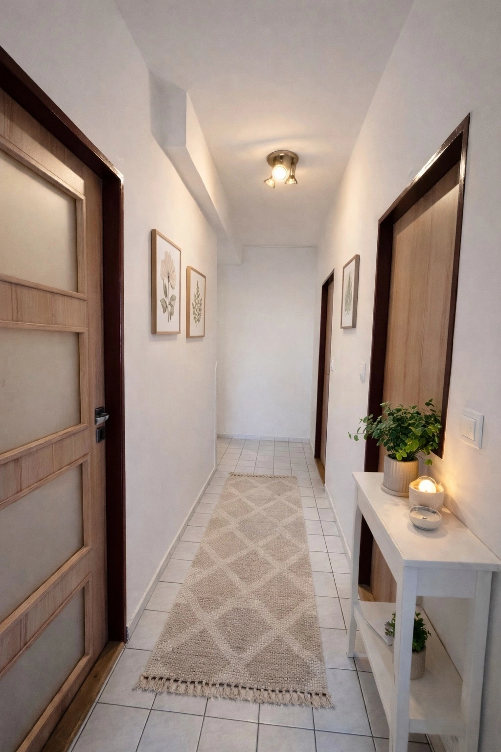 Byt je moderně dispozičně řešený a poskytuje dostatek místa pro pohodlný rodinný život. Najdete zde vzdušnou vstupní chodbu, velkou kuchyni, obývací pokoj s jídelnou, který se stane srdcem domova. Dále tři samostatné pokoje, koupelnu, samostatné WC, a praktickou šatnu.
