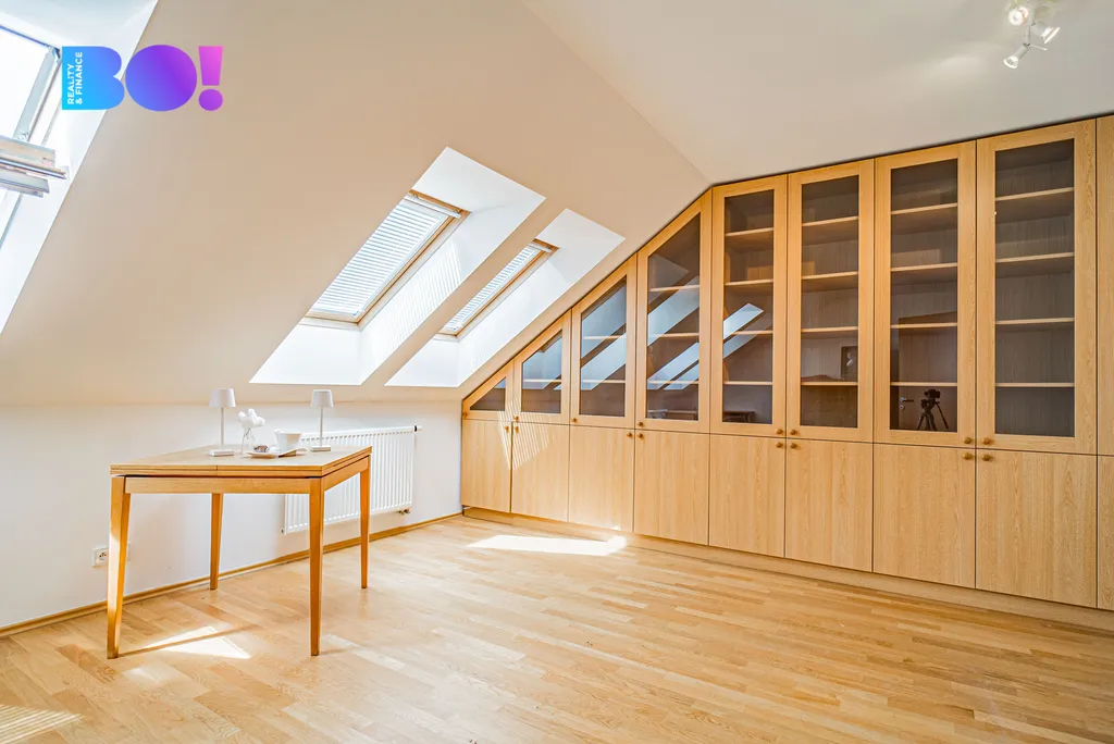 Kuchyň propojená s obývacím pokojem nabízí 55 m² nadčasového prostoru s velkým množstvím denního světla – vysoké stropy a velká okna vytváří vzdušný dojem, který nebývá v řadových domech obvyklý. V celém domě naleznete kvalitní dřevěné masivní podlahy, dveře a zárubně i dřevěná střešní okna Velux a nadčasový design. V domě jsou dvě koupelny a každé patro má min. 1 WC, což je komfortní i pro větší rodinu nebo zástupce více generací. Všechna okna jsou opatřena žaluziemi.