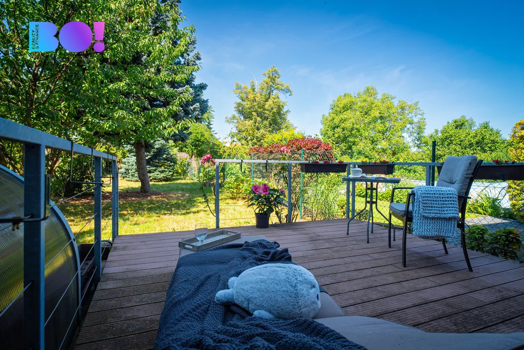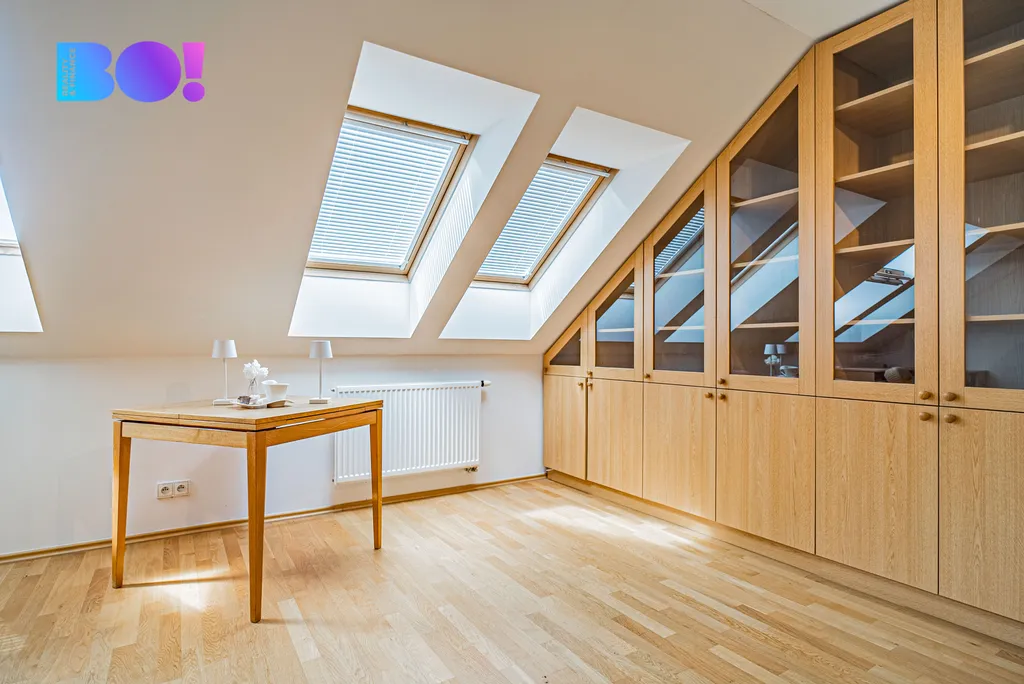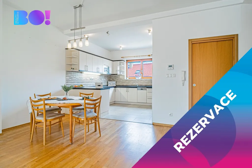 Kuchyň propojená s obývacím pokojem nabízí 55 m² nadčasového prostoru s velkým množstvím denního světla – vysoké stropy a velká okna vytváří vzdušný dojem, který nebývá v řadových domech obvyklý. V celém domě naleznete kvalitní dřevěné masivní podlahy, dveře a zárubně i dřevěná střešní okna Velux a nadčasový design. V domě jsou dvě koupelny a každé patro má min. 1 WC, což je komfortní i pro větší rodinu nebo zástupce více generací. Všechna okna jsou opatřena žaluziemi.
