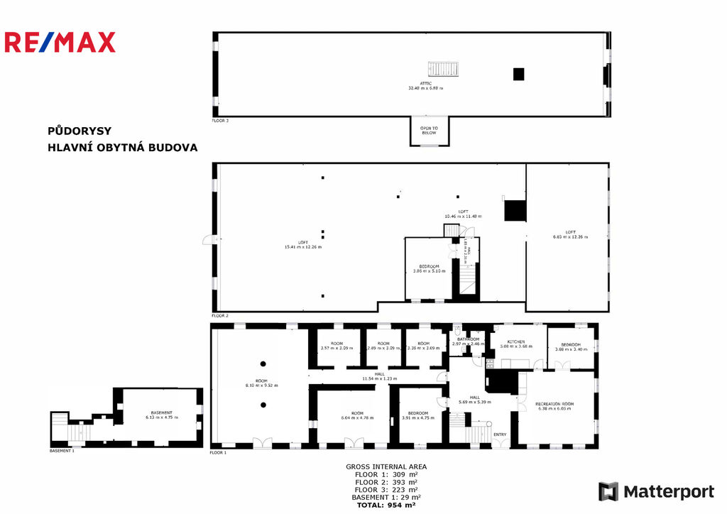 Uzavřený venkovský komplex přináší ve třech budovách k užívání bezmála 2 000 m² plochy. Samotná hlavní obytná budova se třemi podlažími a sklepem nabídne nadstandardních 954 m².