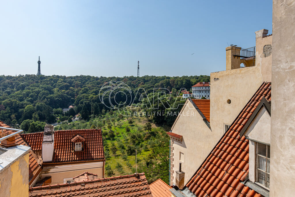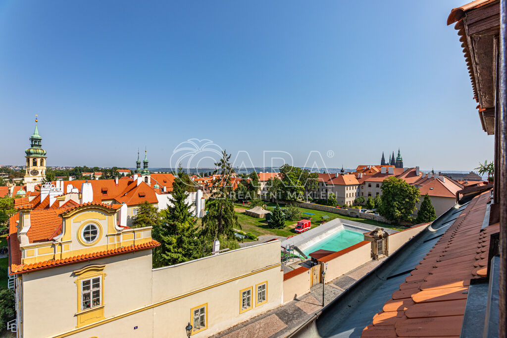 We are offering for rent a truly exceptional duplex apartment (2+kk, 110 m²) located in the historically significant house “U Hodinářů” right on Loretánské Square, in the very heart of Prague. Situated on the 4th and 5th floors, the apartment boasts breathtaking views of Prague Castle, the Loreto, and from the bathroom even of Petřín Lookout Tower.