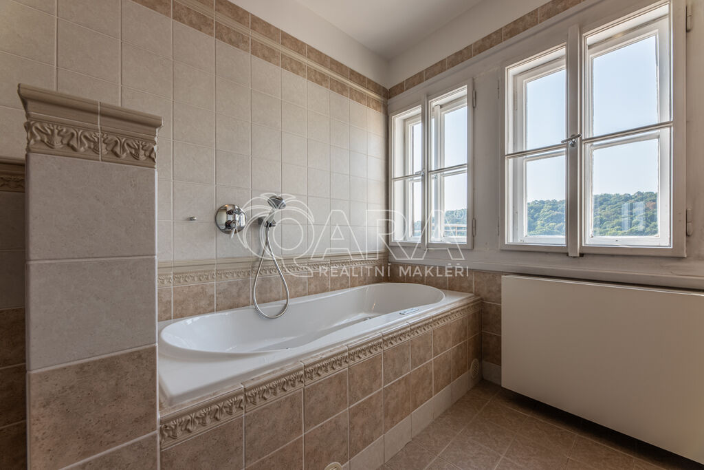 5. nadzemní podlaží: ložnice s klimatizací a výhledem na Loretu a Pražský hrad, koupelna se sprchovým koutem, vířivou vanou s výhledem na Petřín, toaletou a bidetem.