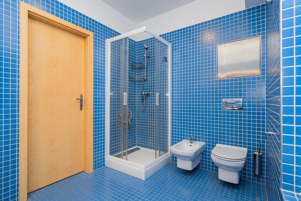 Dvě toalety: jedna koupelna s vanou i sprchovým koutem a toaletou, druhá toaleta zvlášť.