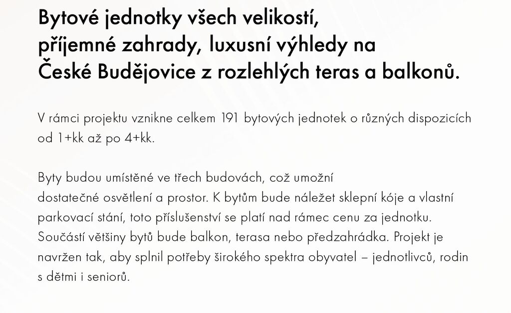 Projekt nabízí kombinaci cenově dostupného bydlení s občanskou vybaveností a dobrou dopravní dostupností, a to v lokalitě, která umožňuje kontakt s přírodou. Díky tomu je vhodná pro rodiny, jednotlivce i seniory, kteří hledají vyvážené a funkční bydlení v bezprostřední blízkosti Českých Budějovic.