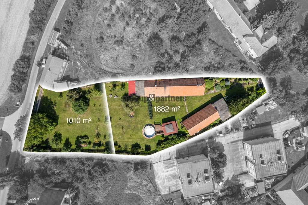 • 1 010 m² – zahrada vedená jako stavební parcela, s vlastní přístupovou cestou a kompletními inženýrskými sítěmi na hranici pozemku.