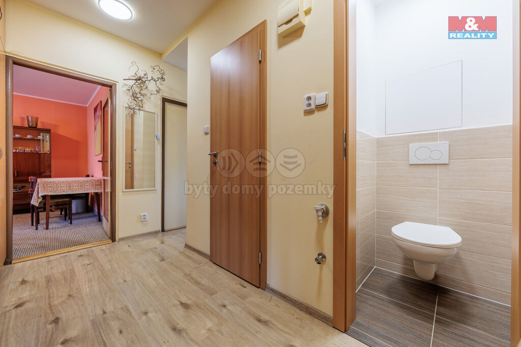 Dispozice bytu zahrnuje tři neprůchozí pokoje, které umožňují dostatek soukromí pro každého člena domácnosti, dále samostatnou kuchyň, koupelnu, toaletu a prostornou předsíň s možností úložných řešení. K bytu náleží také sklepní kóje, což je praktické pro uskladnění sezónních věcí či sportovního vybavení.