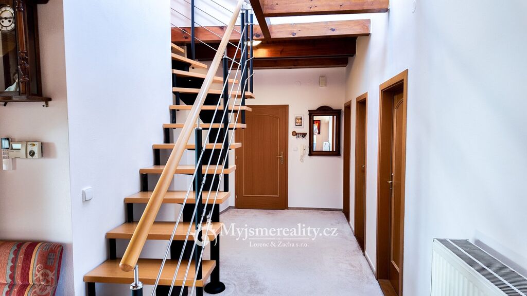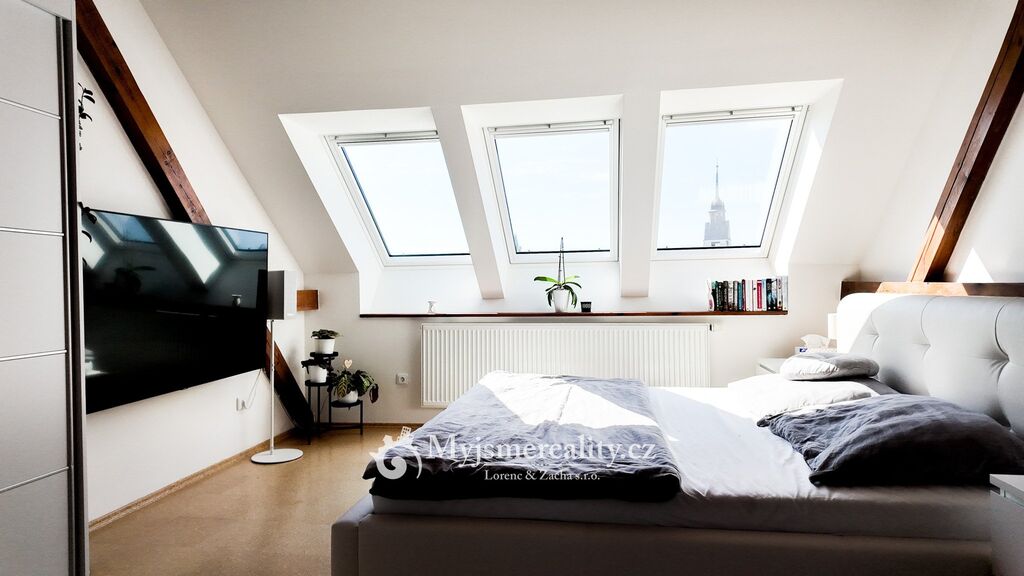 Mezonetový byt o dispozici 5+kk tvoří velkorysý obývací prostor propojený s jídelnou a kuchyňským koutem, čtyři samostatné neprůchozí pokoje, galerie s posezením, dvě koupelny ( první koupelna s vanou a sprchovým koutem, druhá koupelna se sprchovým koutem a toaletou ), samostatná toaleta a dvě komory. Nemusíte se bát ani vyššího podlaží, k dispozici máte prostorný sklep o velikosti cca 40 m². V celém bytě jsou nainstalovány klimatizační jednotky.
