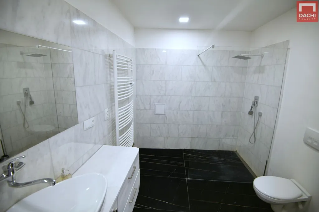 V dolním patře bytu najdeme prostornou předsíň 6 m se šatní skříní, velkorysou obývací zónu 21m s kuchyňským koutem a jídelním stolem. Budoucí majitel bude mít k dispozici luxusní koupelnu 7,3 m obloženou mramorem s prostorným sprchovým koutem, umyvadlem a WC. V horním patře bytu se nachází velmi prostorná ložnice 23 m s nádherným výhledem na olomoucké historické skvosty a dominanty města.
